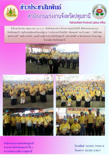 วันที่ 15 ธันวาคม 2561 เวลา 06.00 น. หัวหน้าส่วนราชการ ข้าราชการและเจ้าหน้าที่ สังกัดกระทรวงแรงงาน จังหวัดปทุมธานี ร่วมกิจกรรมจิตอาสาในนามรัฐบาล “เราทำความ ดี ด้วยหัวใจ” เดินรณรงค์ “คน รัก คลอง”… “ไม่ทิ้ง ไม่เท ทุ่ม