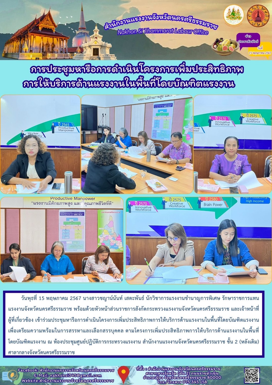 วันที่ 15 พฤษภาคม 2567 สำนักงานแรงงานจังหวัดนครศรีธรรมราช เข้าร่วมประชุมคณะกรรมการบริหารงานการขับเคลื่อนและขยายผลโครงการอันเนื่องมาจากพระราชดำริและหลักปรัชญาของเศรษฐกิจพอเพียงจังหวัดนครศรีธรรมราช ครั้งที่ 1/2567