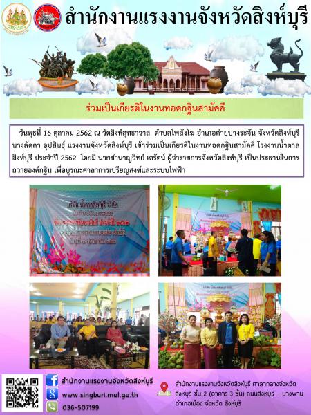 วันที่ 16 ตุลาคม 2562 นางลัดดา อุปสินธุ์ แรงงานจังหวัดสิงห์บุรี เข้าร่วมเป็นเกียรติในงานทอดกฐินสามัคคี โรงงานน้ำตาลสิงห์บุรี ปี 2562 ณ วัดสิงห์สุทธาวาส ต.โพสังโฆ อ.ค่ายบางระจัน จ.สิงห์บุรี