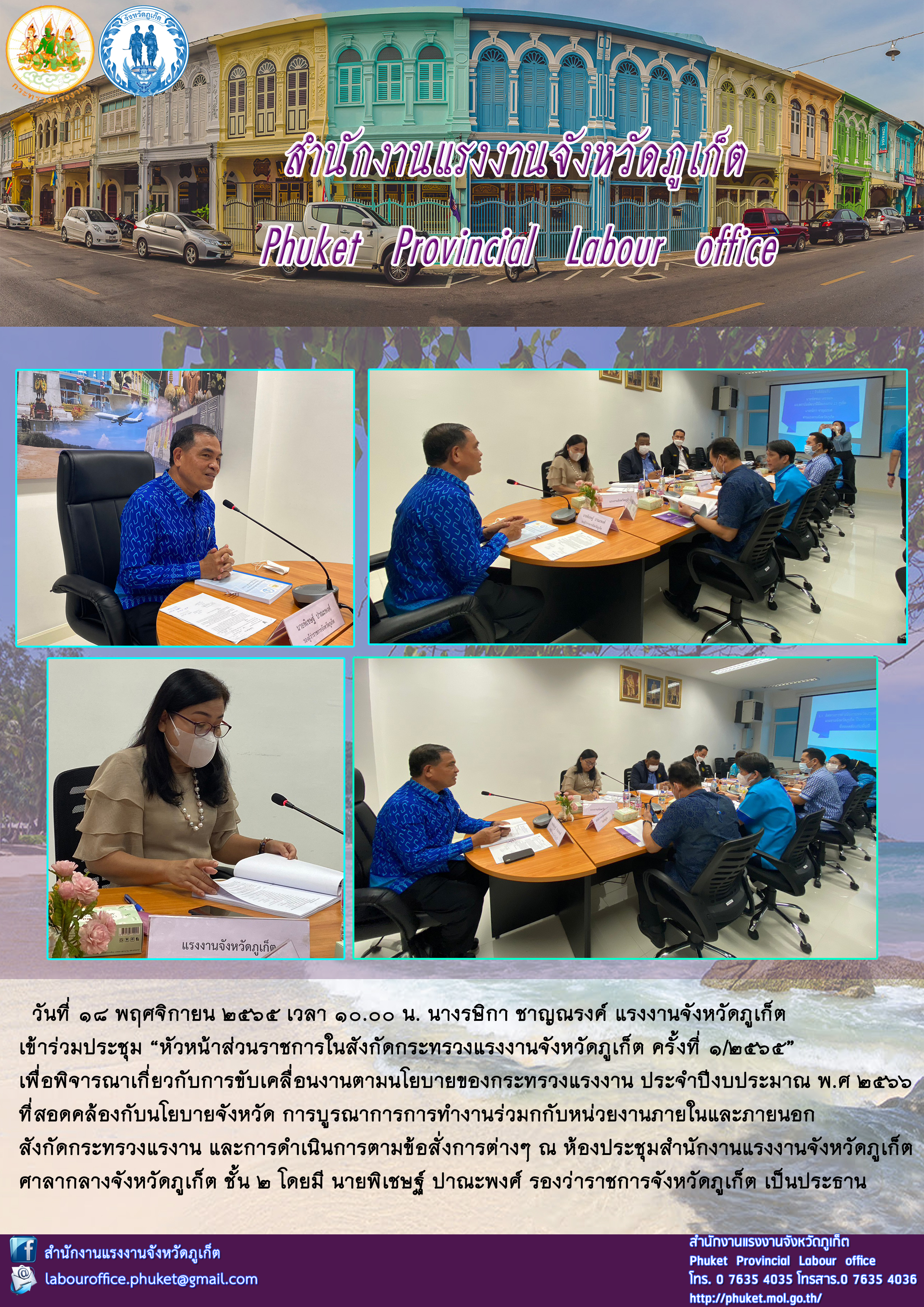 วันที่ 18 พฤศจิกายน 2565 เวลา 10.00 น. นางรษิกา ชาญณรงค์ แรงงานจังหวัดภูเก็ต เข้าร่วมประชุม “หัวหน้าส่วนราชการในสังกัดกระทรวงแรงงานจังหวัดภูเก็ต ครั้งที่ 1/2565”