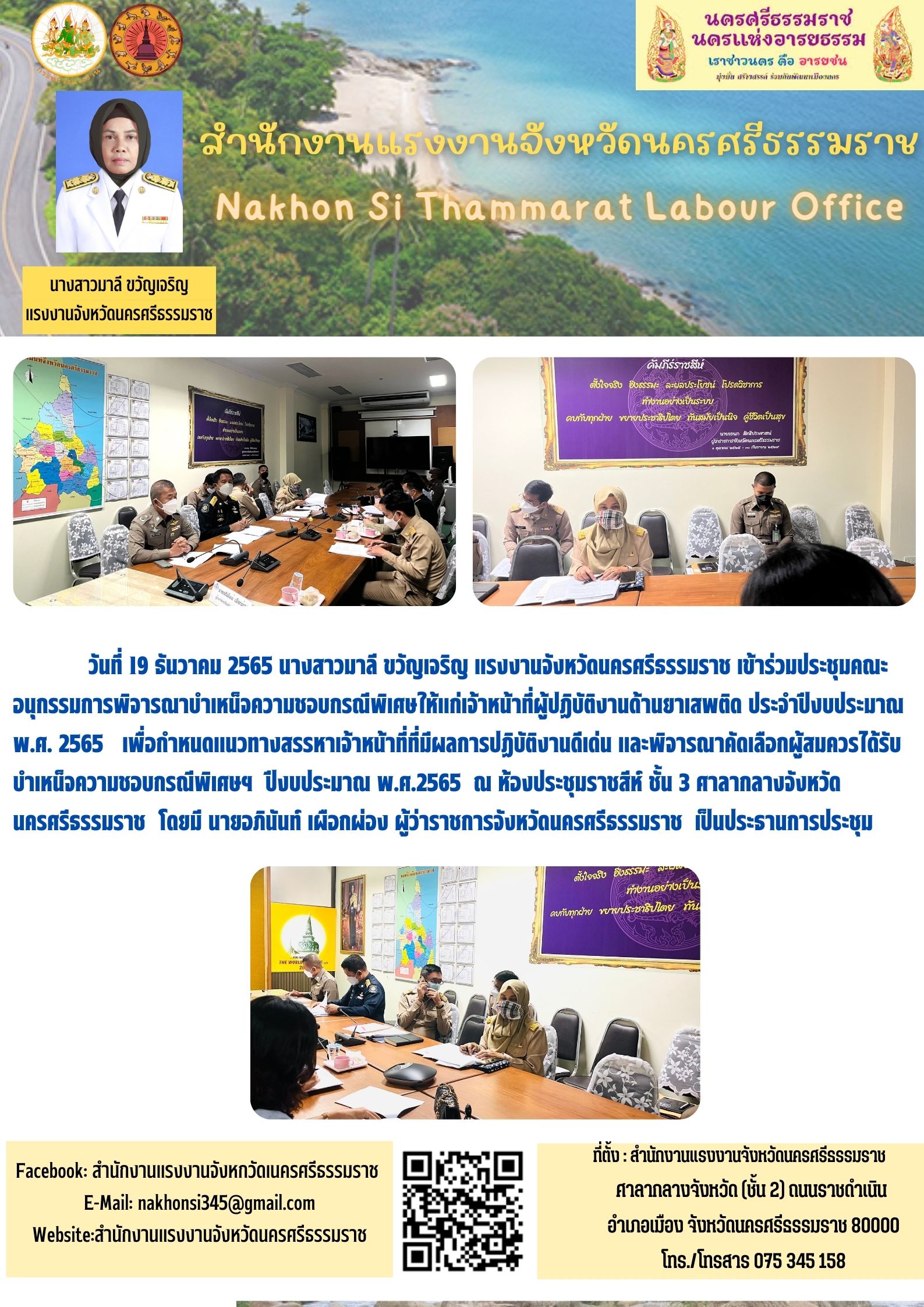 วันที่ 19 ธันวาคม 2565 นางสาวมาลี ขวัญเจริญ แรงงานจังหวัดนครศรีธรรมราช เข้าร่วมประชุมคณะอนุกรรมการพิจารณาบำเหน็จความชอบกรณีพิเศษให้แก่เจ้าหน้าที่ผู้ปฏิบัติงานด้านยาเสพติด ประจำปีงบประมาณ พ.ศ. 2565 เพื่อกำหนดแนวทางสรรหาเจ้าหน้าที่ที่มีผลการปฏิบัติงานดีเด่น และพิจารณาคัดเลือกผู้สมควรได้รับบำเหน็จความชอบกรณีพิเศษฯ ปีงบประมาณ พ.ศ.2565 ณ ห้องประชุมราชสีห์ ชั้น 3 ศาลากลางจังหวัดนครศรีธรรมราช โดยมี นายอภินันท์ เผือกผ่อง ผู้ว่าราชการจังหวัดนครศรีธรรมราช เป็นประธานการประชุม