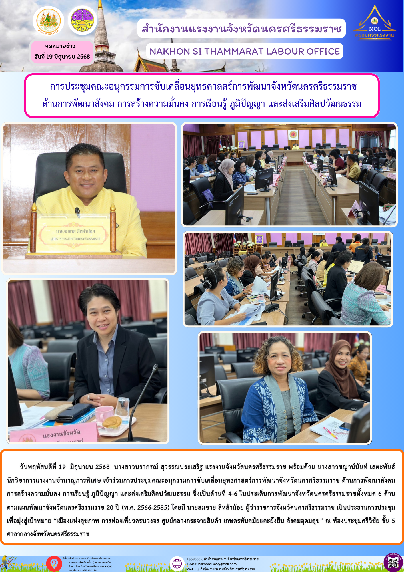 วันที่ 19 มิถุนายน 2568 นางสาวนราภรณ์ สุวรรณประเสริฐ แรงงานจังหวัดนครศรีธรรมราช พร้อมด้วย นางสาวชญาน์นันท์ เสตะพันธ์ นักวิชาการแรงงานชำนาญการพิเศษ เข้าร่วมการประชุมคณะอนุกรรมการขับเคลื่อนยุทธศาสตร์การพัฒนาจังหวัดนครศรีธรรมราช