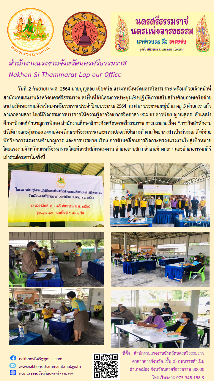 แรงงานจังหวัดนครศรีธรรมราช พร้อมด้วยเจ้าหน้าที่สำนักงานแรงงานจังหวัดนครศรีธรรมราช ลงพื้นที่จัดโครงการประชุมเชิงปฏิบัติการเสริมสร้างศักยภาพเครือข่ายอาสาสมัครแรงงานจังหวัดนครศรีธรรมราช ประจำปีงบประมาณ 2564