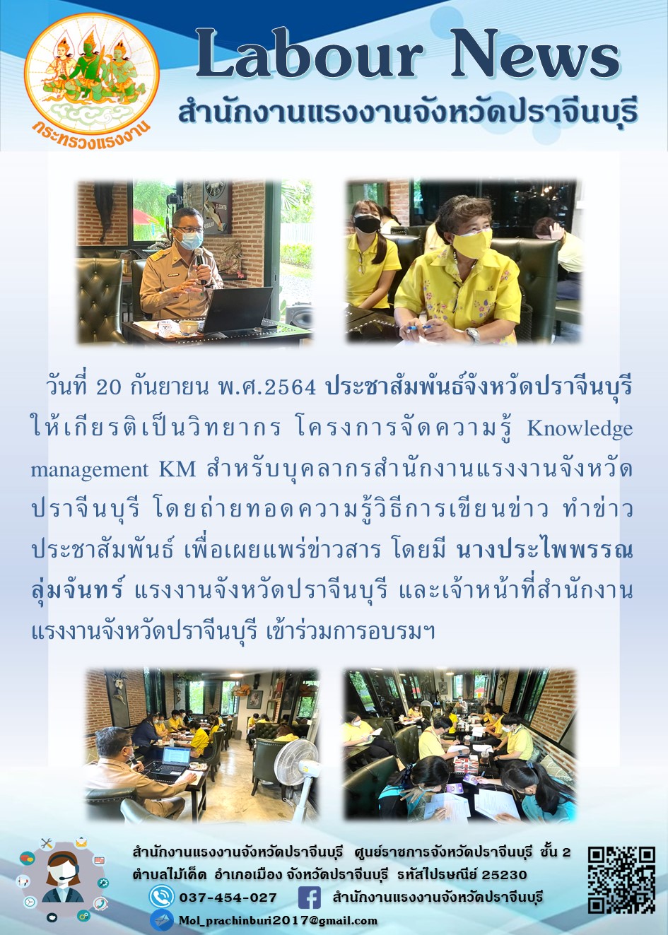 วันที่ 20 กันยายน พ.ศ.2564 นายณรงค์ เจนประกอบกิจ ประชาสัมพันธ์จังหวัดปราจีนบุรี ให้เกียรติเป็นวิทยากร โครงการจัดความรู้ Knowledge management KM สำหรับบุคลากรสำนักงานแรงงานจังหวัดปราจีนบุรี โดยถ่ายทอดความรู้วิธีการเขียนข่าว ทำข่าวประชาสัมพันธ์ เพื่อเผยแพร่ข่าวสาร โดยมี นางประไพพรรณ ลุ่มจันทร์ แรงงานจังหวัดปราจีนบุรี และเจ้าหน้าที่สำนักงานแรงงานจังหวัดปราจีนบุรี เข้าร่วมการอบรมฯ