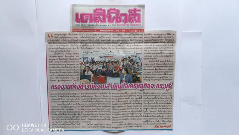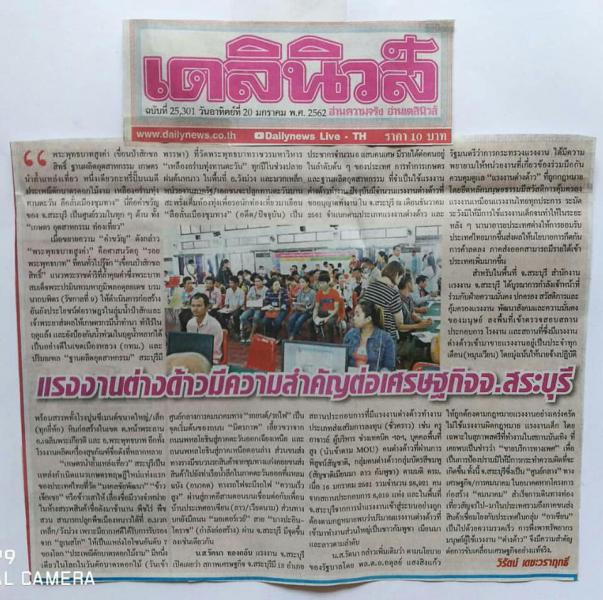 วันที่ 20 มกราคม 2562 หนังสือพิมพ์เดลินิวส์ (ฉบับวันที่ 20 ม.ค. 62 ) ลงข่าวการบูรณาการร่วมกันของหน่วยงานในสังกัดกระทรวงแรงงาน และหน่วยงานที่เกี่ยวข้อง ในหัวข้อ แรงงานต่างด้าวมีความสำคัญต่อเศรษฐกิจจังหวัดสระบุรี