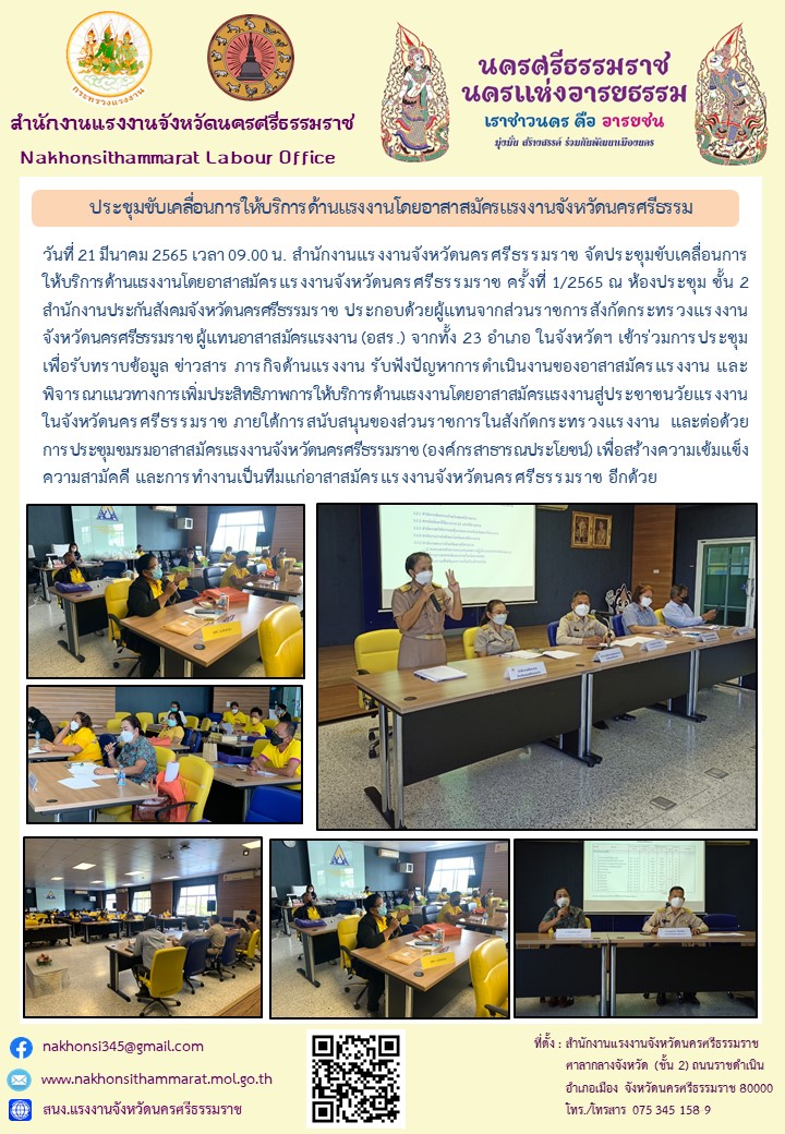 ประกอบด้วยผู้แทนจากส่วนราชการสังกัดกระทรวงแรงงานจังหวัดนครศรีธรรมราช ผู้แทนอาสาสมัครแรงงาน (อสร.) จากทั้ง 23 อำเภอ ในจังหวัดฯ เข้าร่วมการประชุมเพื่อรรับทราบข่าวสารข้อมูล ข่าวสาร ภารกิจด้านแรงงาน รับฟังปัญหาการดำเนินงานของอาสาสมัครแรงงาน และพิจารณาแนวทางการเพิ่มประสิทธิภาพการให้บริการด้านแรงงานโดยอาสาสมัครแรงงานสู่ประชาชนวัยแรงงานในจังหวัดนครศรีธรรมราช ภายใต้การสนับสนุนของส่วนราชการในสังกัดกระทรวงแรงงาน และต่อด้วยการประชุมชมรมอาสาสมัครแรงงานจังหวัดนครศรีธรรมราช (องค์กรสาธารณประโยชน์) เพื่อสร้างความเข็มแข็ง ความสามัคคี แลการทำงานเป็นทีมแก่อาสาสมัครแรงงานจังหวัดนครศรีธรรมราช