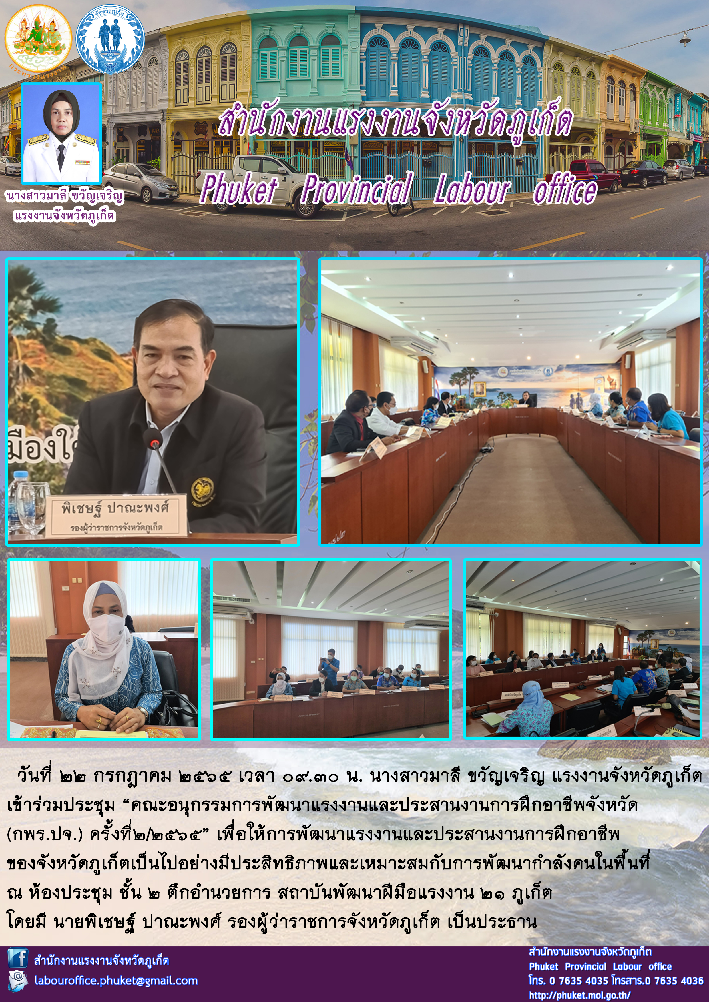 นางสาวมาลี ขวัญเจริญ แรงงานจังหวัดภูเก็ต เข้าร่วมประชุม “คณะอนุกรรมการพัฒนาแรงงานและประสานงานการฝึกอาชีพจังหวัด (กพร.ปจ.) ครั้งที่2/2565”