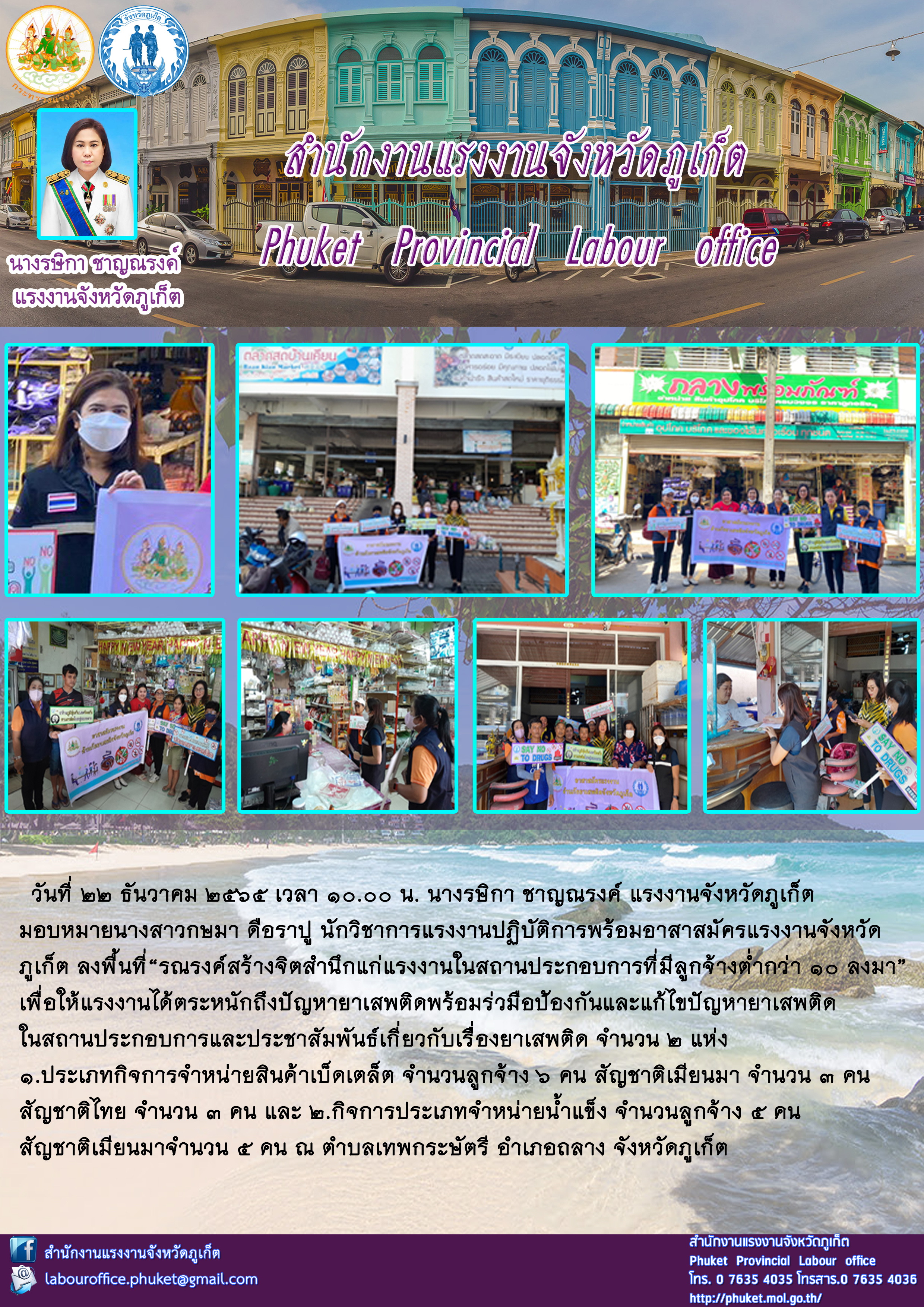แรงงานจังหวัดภูเก็ต มอบหมายนางสาวกษมา ดือราปู นักวิชาการแรงงานปฏิบัติการพร้อมอาสาสมัครแรงงานจังหวัดภูเก็ต ลงพื้นที่ “รณรงค์สร้างจิตสำนึกแก่แรงงานในสถานประกอบการที่มีลูกจ้างต่ำกว่า 10 ลงมา”