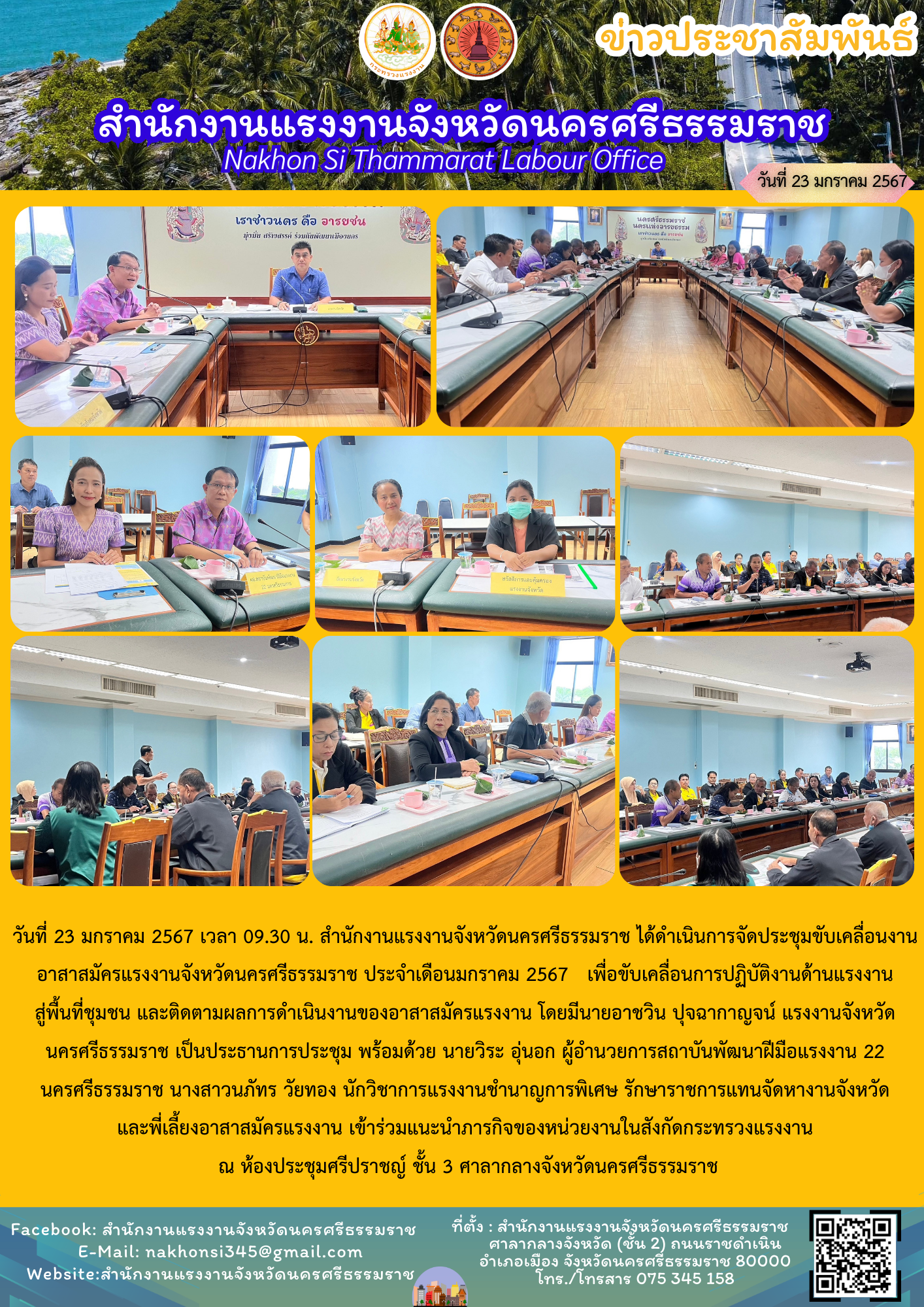 สรจ.นครศรีธรรมราช ได้ดำเนินการจัดประชุมขับเคลื่อนงานอาสาสมัครแรงงานจังหวัดนครศรีธรรมราช ประจำเดือนมกราคม 2567 เพื่อขับเคลื่อนการปฏิบัติงานด้านแรงงาน สู่พื้นที่ชุมชน และติดตามผลการดำเนินงานของอาสาสมัครแรงงาน
