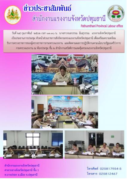 วันที่ 25 กุมภาพันธ์ 2562 เวลา 13.30 น. นางสาวกมลวรรณ อิ่มสุวรรณ แรงงานจังหวัดปทุมธานี เป็นประธานการประชุม หัวหน้าส่วนราชการสังกัดกระทรงแรงงานจังหวัดปทุมธานีปทุมธานี