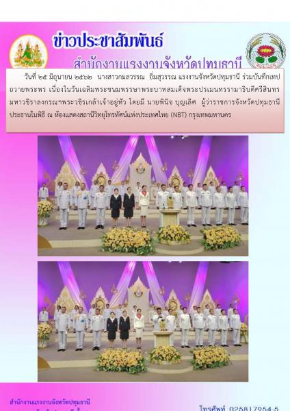 วันที่ 25 มิถุนายน 2562 นางสาวกมลวรรณ อิ่มสุวรรณ แรงงานจังหวัดปทุมธานี ร่วมบันทึกเทปถวายพระพร เนื่องในวันเฉลิมพระชนมพรรษาพระบาทสมเด็จพระปรเมนทรรามาธิบดีศรีสินทร มหาวชิราลงกรณฯพระวชิรเกล้าเจ้าอยู่หัว