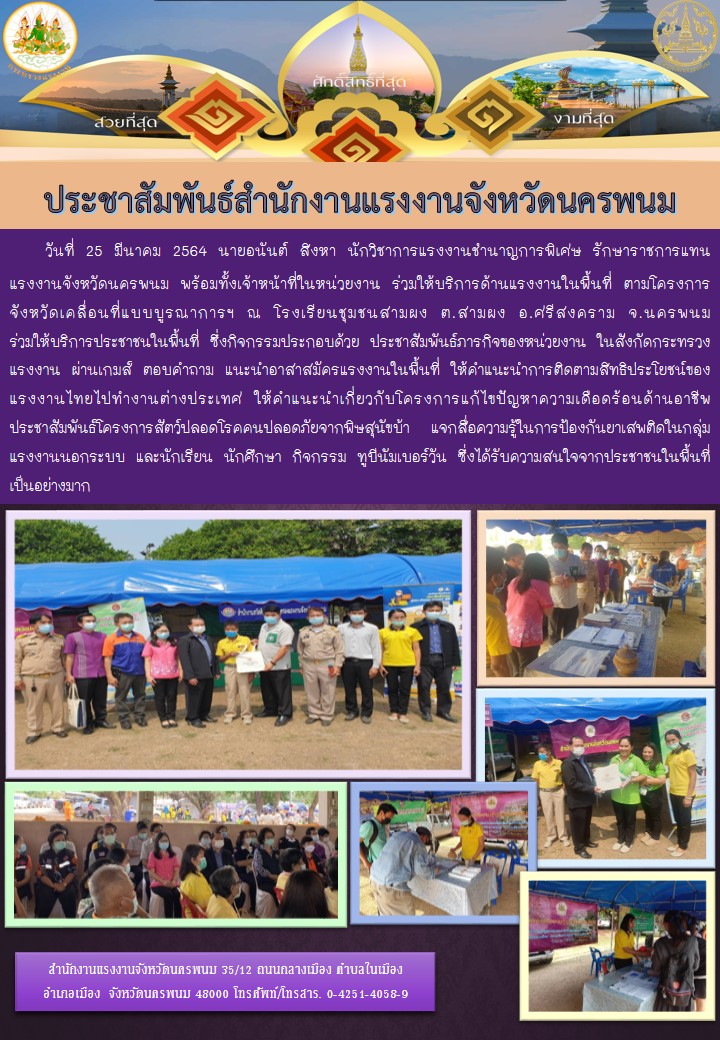 วันที่ 25 มีนาคม 2564 นายอนันต์ สิงหา นักวิชาการแรงงานชำนาญการพิเศษ รักษาราชการแทน แรงงานจังหวัดนครพนม พร้อมทั้งเจ้าหน้าที่ในหน่วยงาน ร่วมให้บริการด้านแรงงานในพื้นที่ ตามโครงการ จังหวัดเคลื่อนที่แบบบูรณาการฯ ณ โรงเรียนชุมชนสามผง ต.สามผง อ.ศรีสงคราม จ.นครพนม ร่วมให้บริการประชาชนในพื้นที่ ซึ่งกิจกรรมประกอบด้วย ประชาสัมพันธ์ภารกิจของหน่วยงาน ในสังกัดกระทรวงแรงงาน ผ่านเกมส์ ตอบคำถาม แนะนำอาสาสมัครแรงงานในพื้นที่ ให้คำแนะนำการติดตามสิทธิประโยชน์ของแรงงานไทยไปทำงานต่างประเทศ ให้คำแนะนำเกี่ยวกับโครงการแก้ไขปัญหาความเดือดร้อนด้านอาชีพ ประชาสัมพันธ์โครงการสัตว์ปลอดโรคคนปลอดภัยจากพิษสุนัขบ้า แจกสื่อความรู้ในการป้องกันยาเสพติดในกลุ่มแรงงานนอกระบบ และนักเรียน นักศึกษา กิจกรรม ทูบีนัมเบอร์วัน ซึ่งได้รับความสนใจจากประชาชนในพื้นที่เป็นอย่างมาก