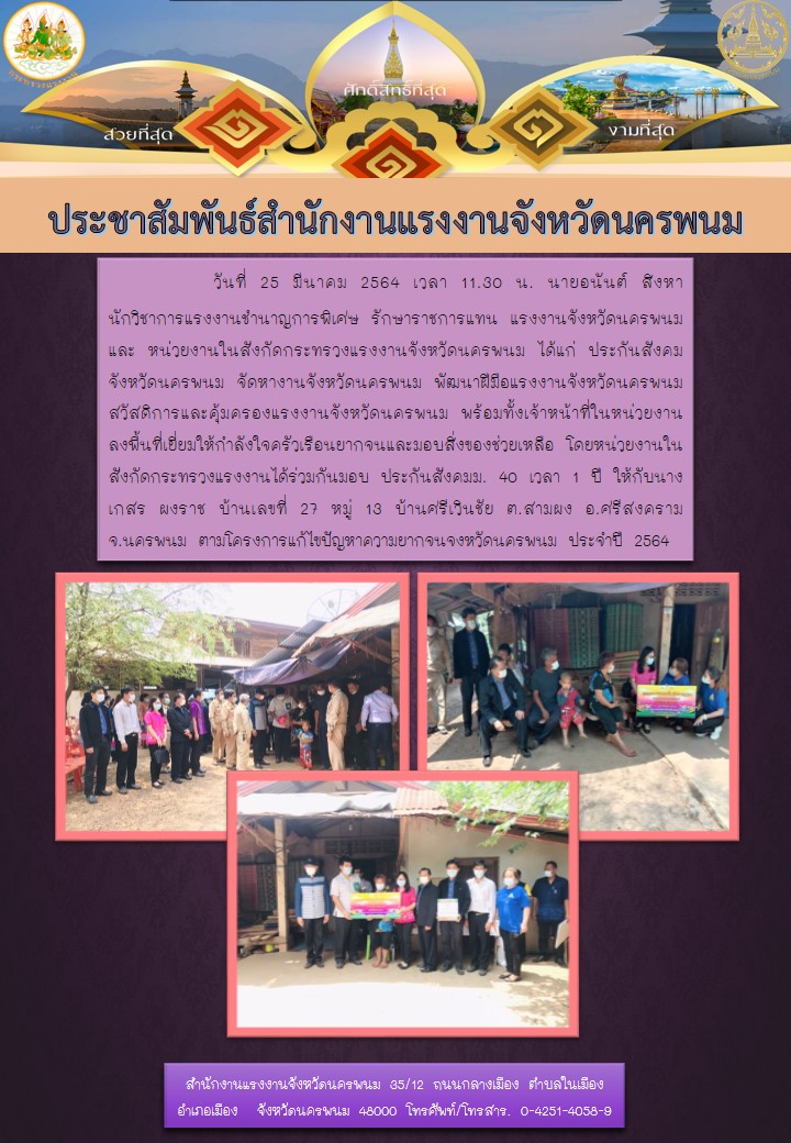 วันที่ 25 มีนาคม 2564 เวลา 11.30 น. นายอนันต์ สิงหา นักวิชาการแรงงานชำนาญการพิเศษ รักษาราชการแทน แรงงานจังหวัดนครพนม และ หน่วยงานในสังกัดกระทรวงแรงงานจังหวัดนครพนม ได้แก่ ประกันสังคมจังหวัดนครพนม จัดหางานจังหวัดนครพนม พัฒนาฝีมือแรงงานจังหวัดนครพนม สวัสดิการและคุ้มครองแรงงานจังหวัดนครพนม พร้อมทั้งเจ้าหน้าที่ในหน่วยงาน ลงพื้นที่เยี่ยมให้กำลังใจครัวเรือนยากจนและมอบสิ่งของช่วยเหลือ โดยหน่วยงานในสังกัดกระทรวงแรงงานได้ร่วมกันมอบ ประกันสังคมม. 40 เวลา 1 ปี ให้กับนางเกสร ผงราช บ้านเลขที่ 27 หมู่ 13 บ้านศรีเวินชัย ต.สามผง อ.ศรีสงคราม จ.นครพนม ตามโครงการแก้ไขปัญหาความยากจนจงหวัดนครพนม ประจำปี 2564