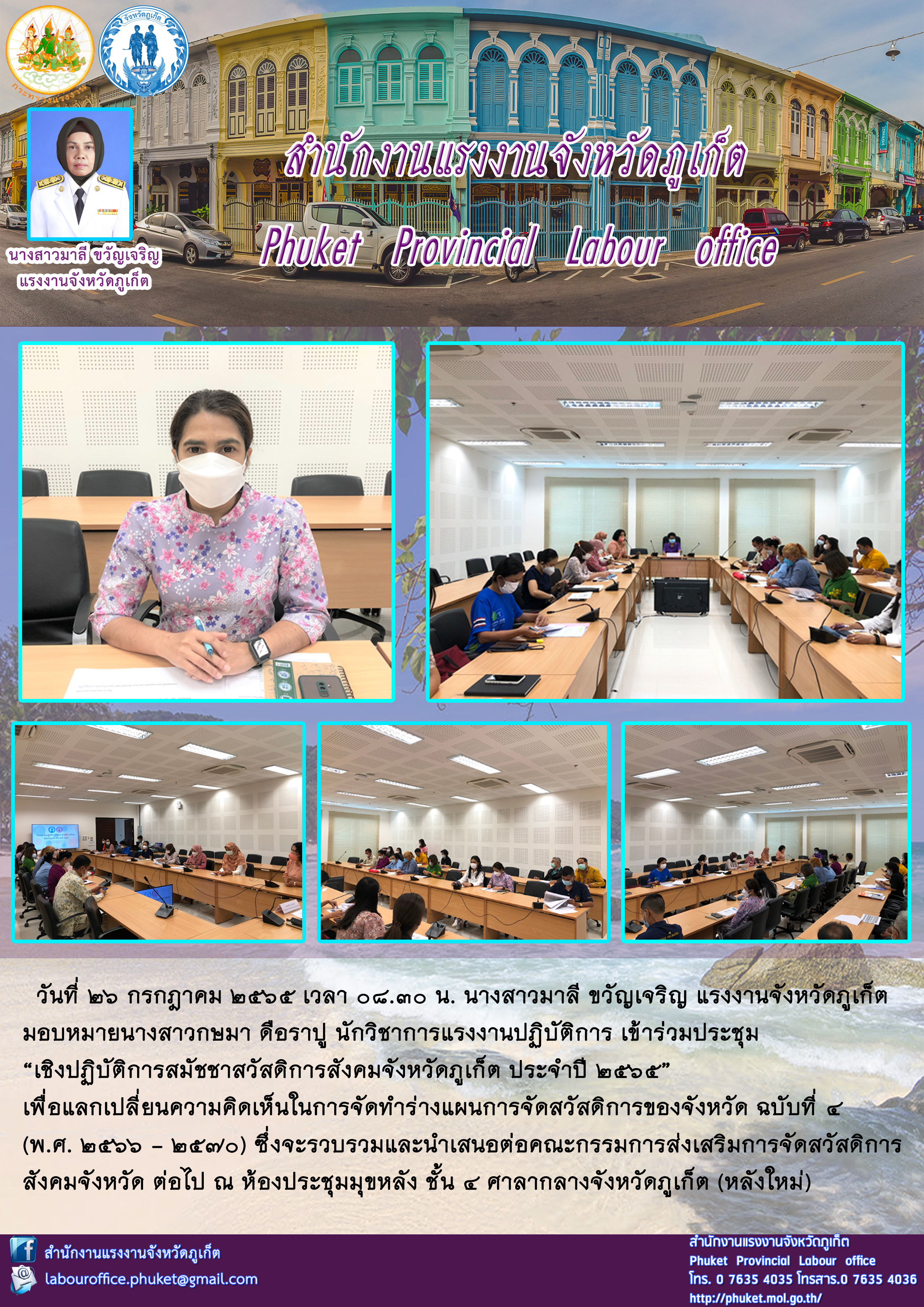 นางสาวมาลี ขวัญเจริญ แรงงานจังหวัดภูเก็ต มอบหมายนางสาวกษมา ดือราปู นักวิชาการแรงงานปฏิบัติการ เข้าร่วมประชุม “เชิงปฏิบัติการสมัชชาสวัสดิการสังคมจังหวัดภูเก็ต ประจำปี 2565”