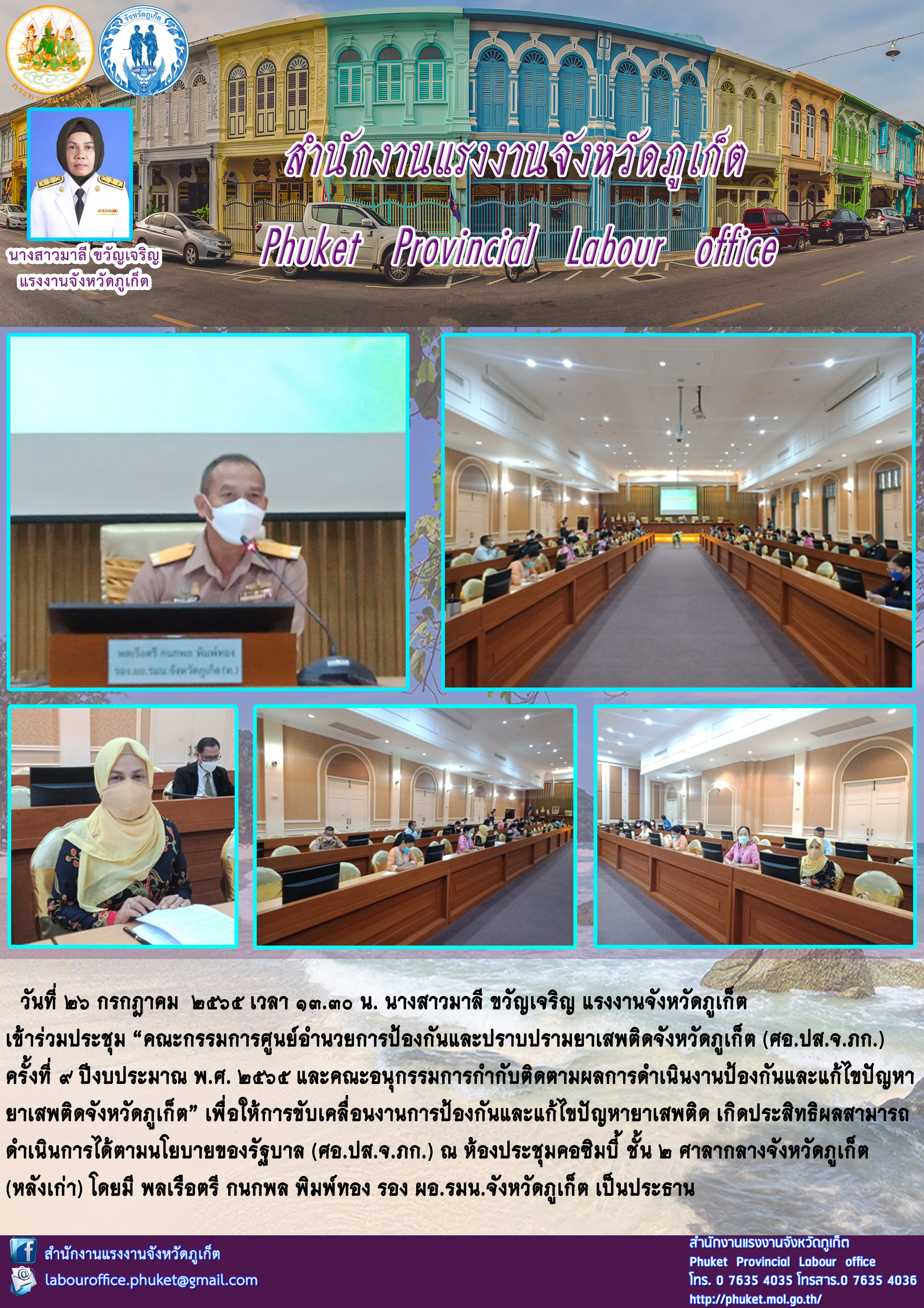 นางสาวมาลี ขวัญเจริญ แรงงานจังหวัดภูเก็ต เข้าร่วมประชุม “คณะกรรมการศูนย์อำนวยการป้องกันและปราบปรามยาเสพติดจังหวัดภูเก็ต (ศอ.ปส.จ.ภก.) ครั้งที่ 9 ปีงบประมาณ พ.ศ. 2565 และคณะอนุกรรมการกำกับติดตามผลการดำเนินงานป้องกันและแก้ไขปัญหายาเสพติดจังหวัดภูเก็ต”