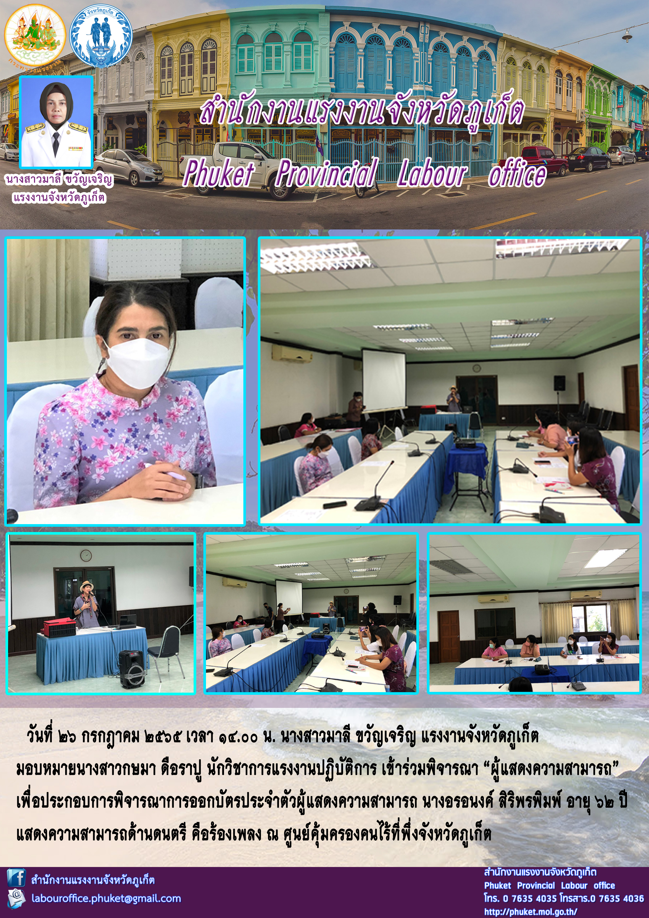 นางสาวมาลี ขวัญเจริญ แรงงานจังหวัดภูเก็ต มอบหมายนางสาวกษมา ดือราปู นักวิชาการแรงงานปฏิบัติการ เข้าร่วมพิจารณา “ผู้แสดงความสามารถ”