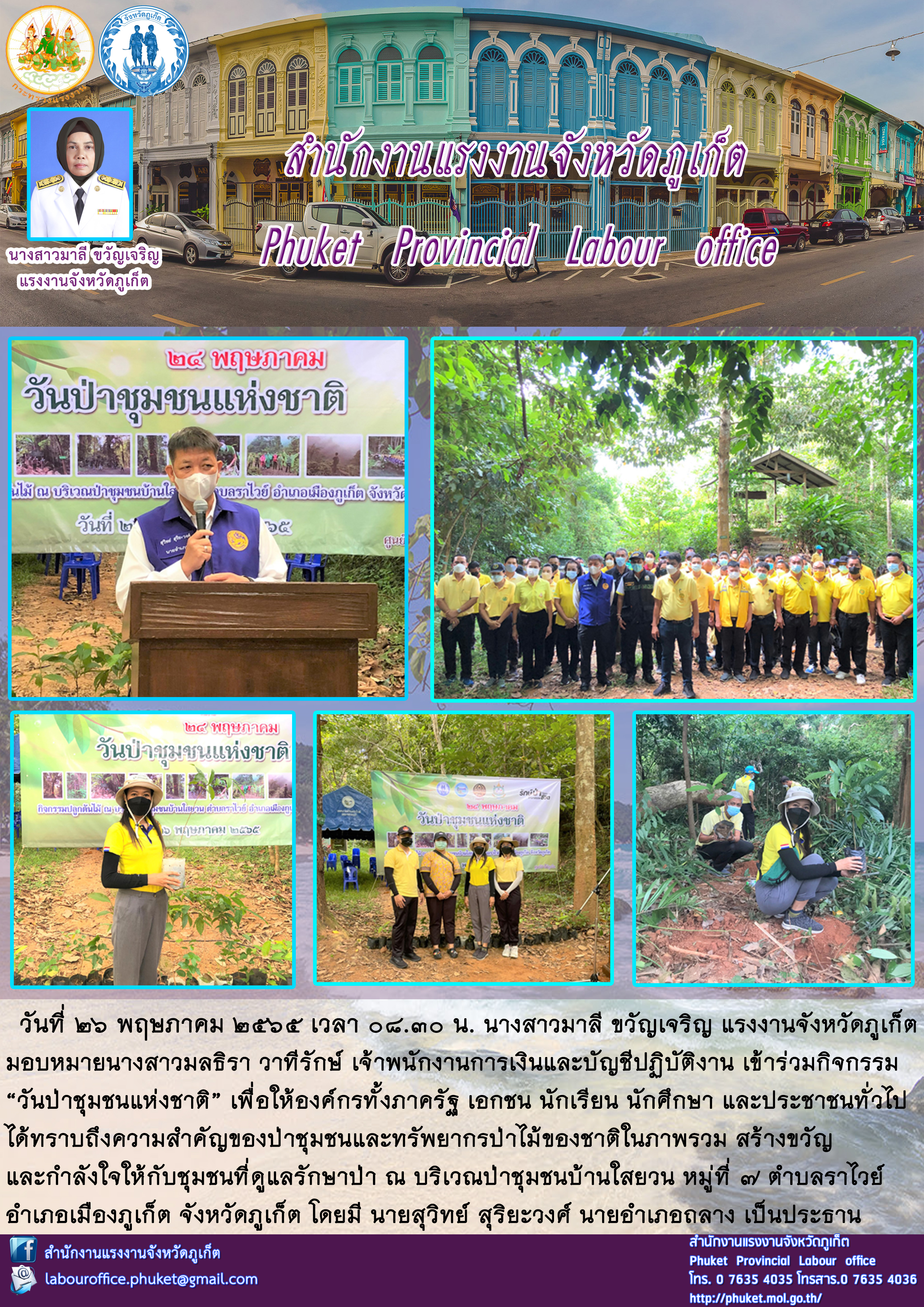 นางสาวมาลี ขวัญเจริญ แรงงานจังหวัดภูเก็ต มอบหมายนางสาวมลธิรา วาทีรักษ์ เจ้าพนักงานการเงินและบัญชีปฏิบัติงาน เข้าร่วมกิจกรรม“วันป่าชุมชนแห่งชาติ”