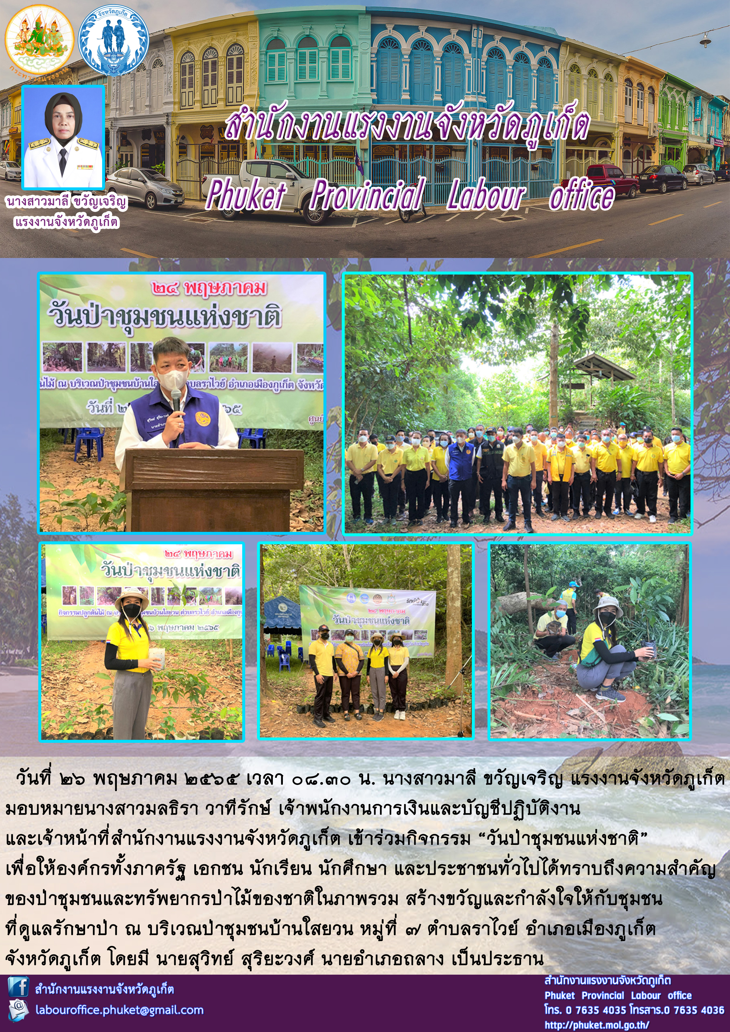 นางสาวมาลี ขวัญเจริญ แรงงานจังหวัดภูเก็ต มอบหมายนางสาวมลธิรา วาทีรักษ์ เจ้าพนักงานการเงินและบัญชีปฏิบัติงาน และเจ้าหน้าที่สำนักงานแรงงานจังหวัดภูเก็ต เข้าร่วมกิจกรรม “วันป่าชุมชนแห่งชาติ”