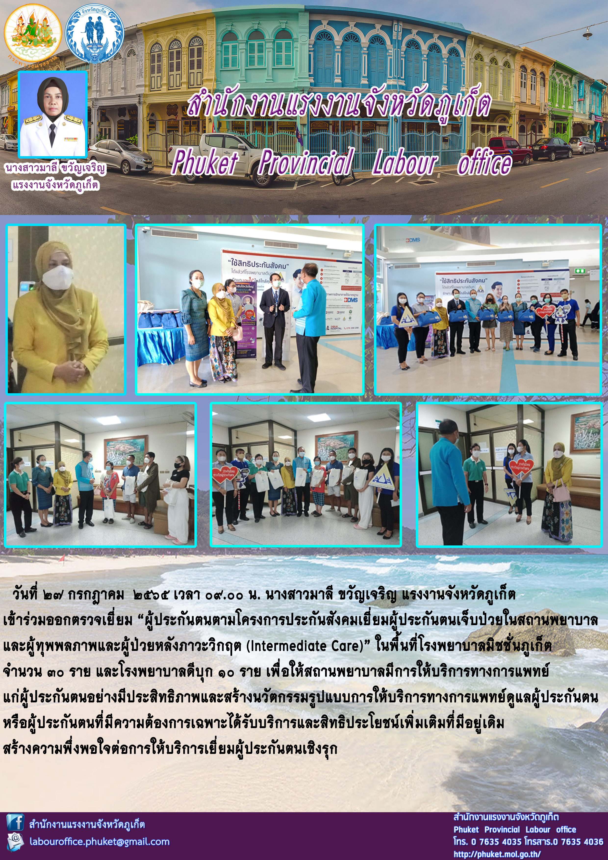 นางสาวมาลี ขวัญเจริญ แรงงานจังหวัดภูเก็ต เข้าร่วมออกตรวจเยี่ยม “ผู้ประกันตนตามโครงการประกันสังคมเยี่ยมผู้ประกันตนเจ็บป่วยในสถานพยาบาลและผู้ทุพพลภาพและผู้ป่วยหลังภาวะวิกฤต (Intermediate Care)”