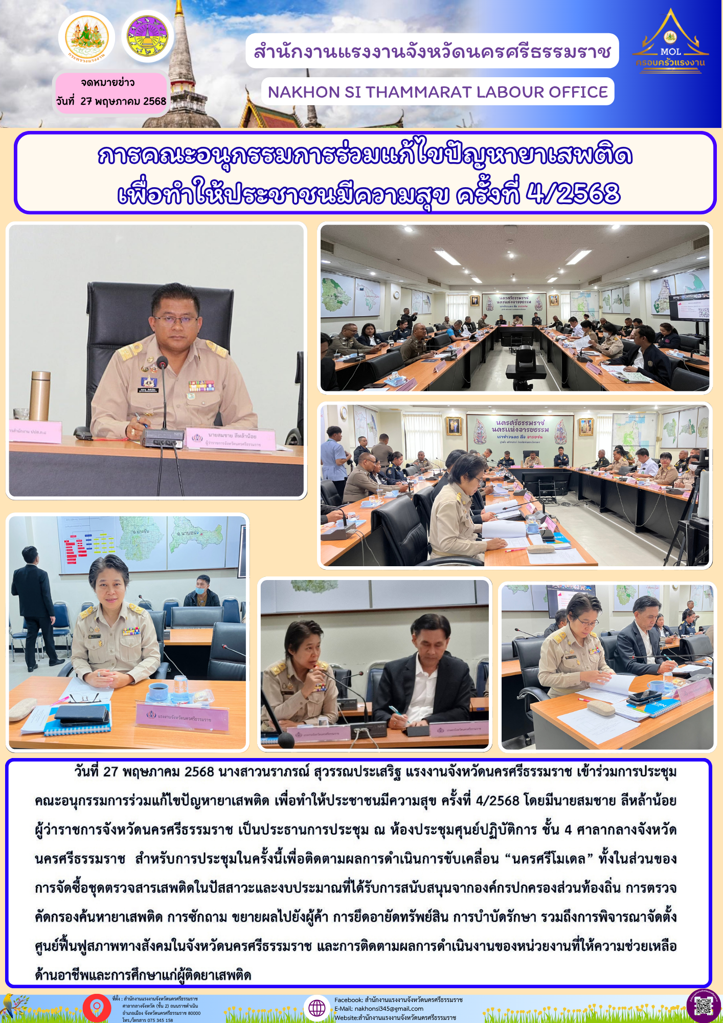 วันที่ 27 พฤษภาคม 2568 นางสาวนราภรณ์ สุวรรณประเสริฐ แรงงานจังหวัดนครศรีธรรมราช เข้าร่วมการประชุมคณะอนุกรรมการร่วมแก้ไขปัญหายาเสพติด เพื่อทำให้ประชาชนมีความสุข ครั้งที่ 4/2568 โดยมีนายสมชาย ลีหล้าน้อย ผู้ว่าราชการจังหวัดนครศรีธรรมราช เป็นประธานการประชุม ณห้องประชุมศุนย์ปฏิบัติการ ชั้น 4 ศาลากลางจังหวัดนครศรีธรรมราช สำหรับการประชุมในครั้งนี้เพื่อติดตามผลการดำเนินการขับเคลื่อน “นครศรีโมเดล” ทั้งในส่วนของการจัดซื้อชุดตรวจสารเสพติดในปัสสาวะและงบประมาณที่ได้รับการสนับสนุนจากองค์กรปกครองส่วนท้องถิ่น การตรวจคัดกรองค้นหายาเสพติด การซักถาม ขยายผลไปยังผู้ค้า การยึดอายัดทรัพย์สิน การบำบัดรักษา รวมถึงการพิจารณาจัดตั้งศูนย์ฟื้นฟูสภาพทางสังคมในจังหวัดนครศรีธรรมราช และการติดตามผลการดำเนินงานของหน่วยงานที่ให้ความช่วยเหลือด้านอาชีพและการศึกษาแก่ผู้ติดยาเสพติด