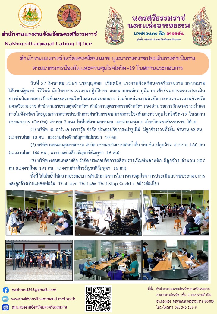 สำนักงแรงงานจังหวัดนครศรีธรรมราชเข้าร่วมการตรวจประเมินการดำเนินมาตรการป้องกันและควบคุมโรคในสถานประกอบการ ร่วมกับหน่วยงานในสังกัดกระทรวงแรงงาน โดยบูรณาการตรวจประเมินการดำเนินการตามมาตรการป้องกันและควบคุมโครโควิด-19 ในสถานประกอบการ จำนวน 3 แห่ง
