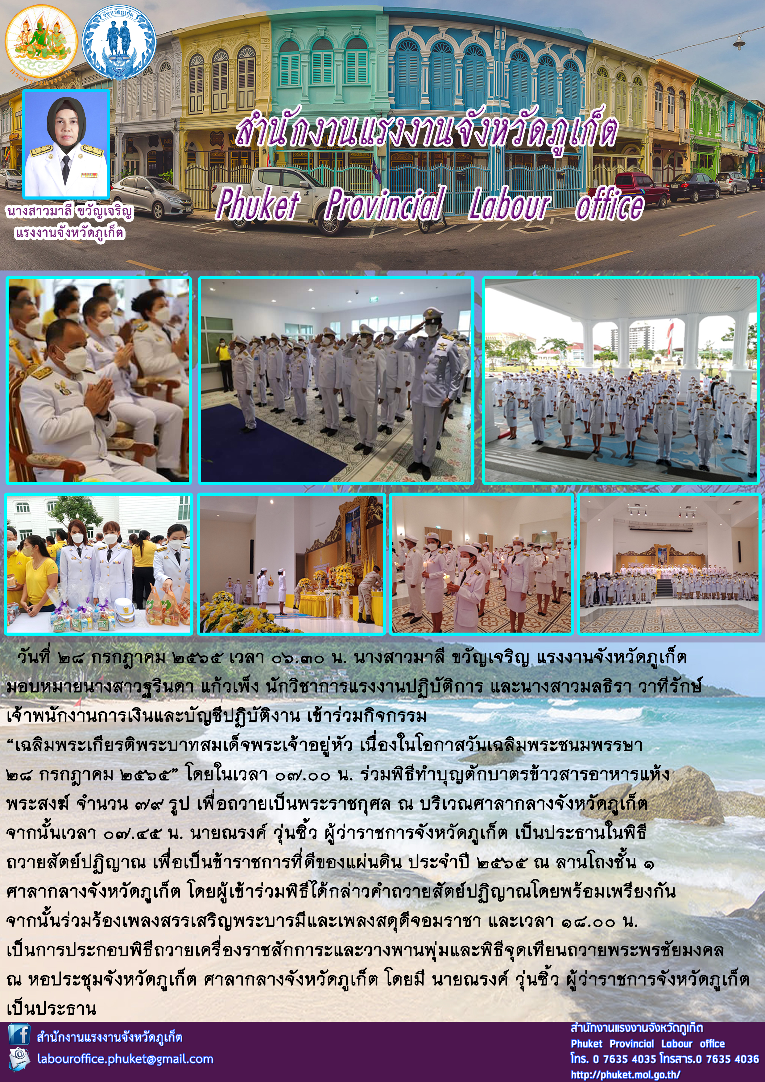 นางสาวมาลี ขวัญเจริญ แรงงานจังหวัดภูเก็ต มอบหมายนางสาวฐรินดา แก้วเพ็ง นักวิชาการแรงงานปฏิบัติการ และนางสาวมลธิรา วาทีรักษ์ เจ้าพนักงานการเงินและบัญชีปฏิบัติงาน เข้าร่วมกิจกรรม “เฉลิมพระเกียรติพระบาทสมเด็จพระเจ้าอยู่หัว เนื่องในโอกาสวันเฉลิมพระชนมพรรษา 28 กรกฎาคม 2565”