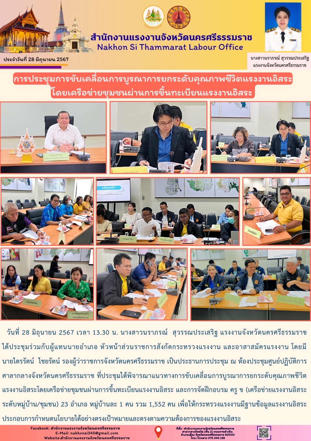 วันที่ 28 มิถุนายน 2567 นางสาวนราภรณ์ สุวรรณประเสริฐ แรงงานจังหวัดนครศรีธรรมราช ได้ประชุมร่วมกับผู้แทนนายอำเภอ หัวหน้าส่วนราชการสังกัดกระทรวงแรงงาน และอาสาสมัครแรงงาน โดยมีนายไตรรัตน์ ไชยรัตน์ รองผู้ว่าราชการจังหวัดนครศรีธรรมราช เป็นประธานการประชุม ณ ห้องประชุมศรีวิชัย ศาลากลางจังหวัดนครศรีธรรมราช ที่ประชุมได้พิจารณาแนวทางการขับเคลื่อนการบูรณาการยกระดับคุณภาพชีวิตแรงงานอิสระโดยเครือข่ายชุมชนผ่านการขึ้นทะเบียนแรงงานอิสระ และการจัดฝึกอบรม ครู ข (เครือข่ายแรงงานอิสระระดับหมู่บ้าน/ชุมชน) 23 อำเภอ
