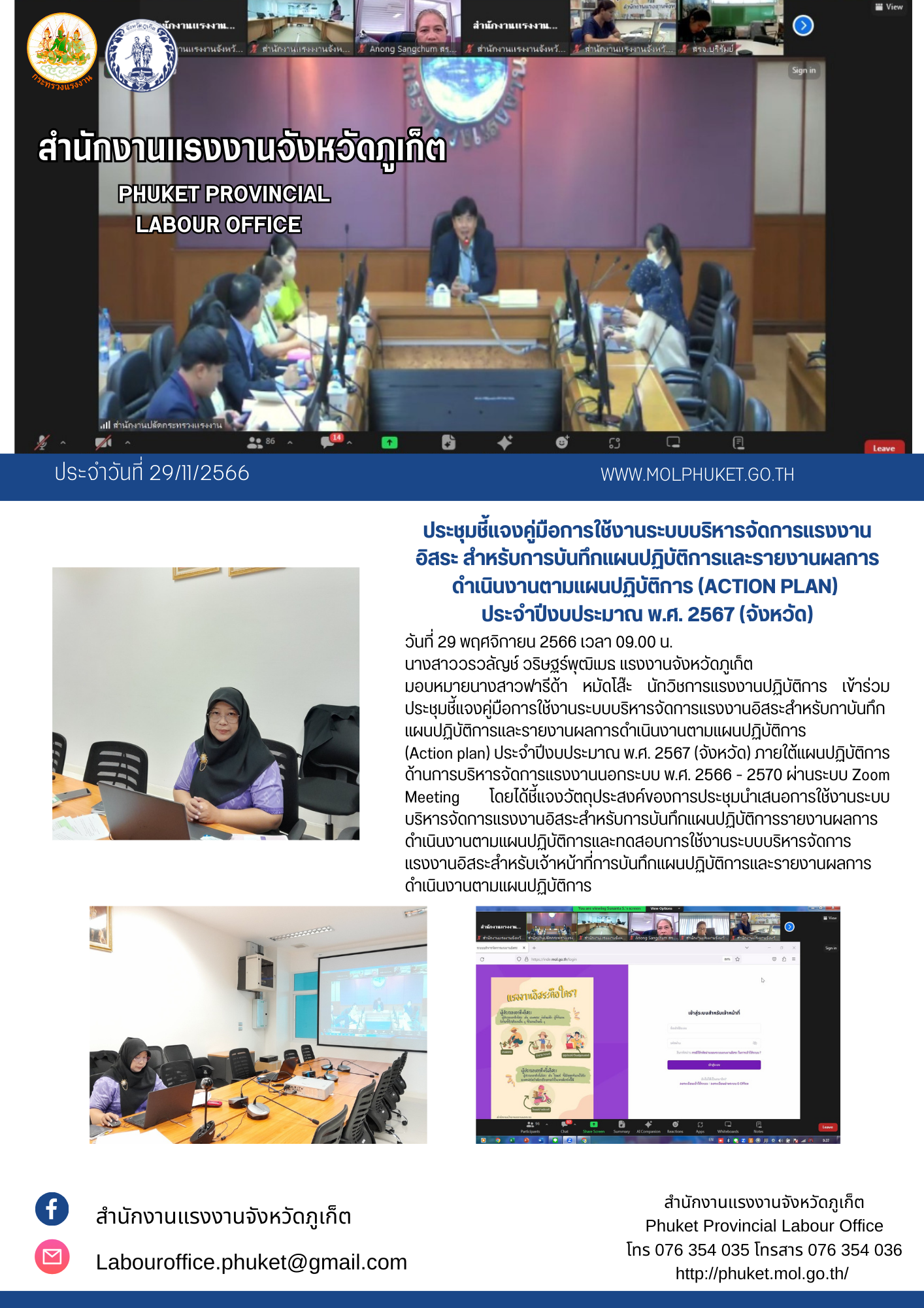 สรจ.ภูเก็ต เข้าร่วมประชุมชี้แจงคู่มือการใช้งานระบบบริหารจัดการแรงงานอิสระสำหรับกาบันทึกแผนปฏิบัติการและรายงานผลการดำเนินงานตามแผนปฏิบัติการ (Action plan) ประจำปีงบประมาณ พ.ศ. 2567 (จังหวัด)