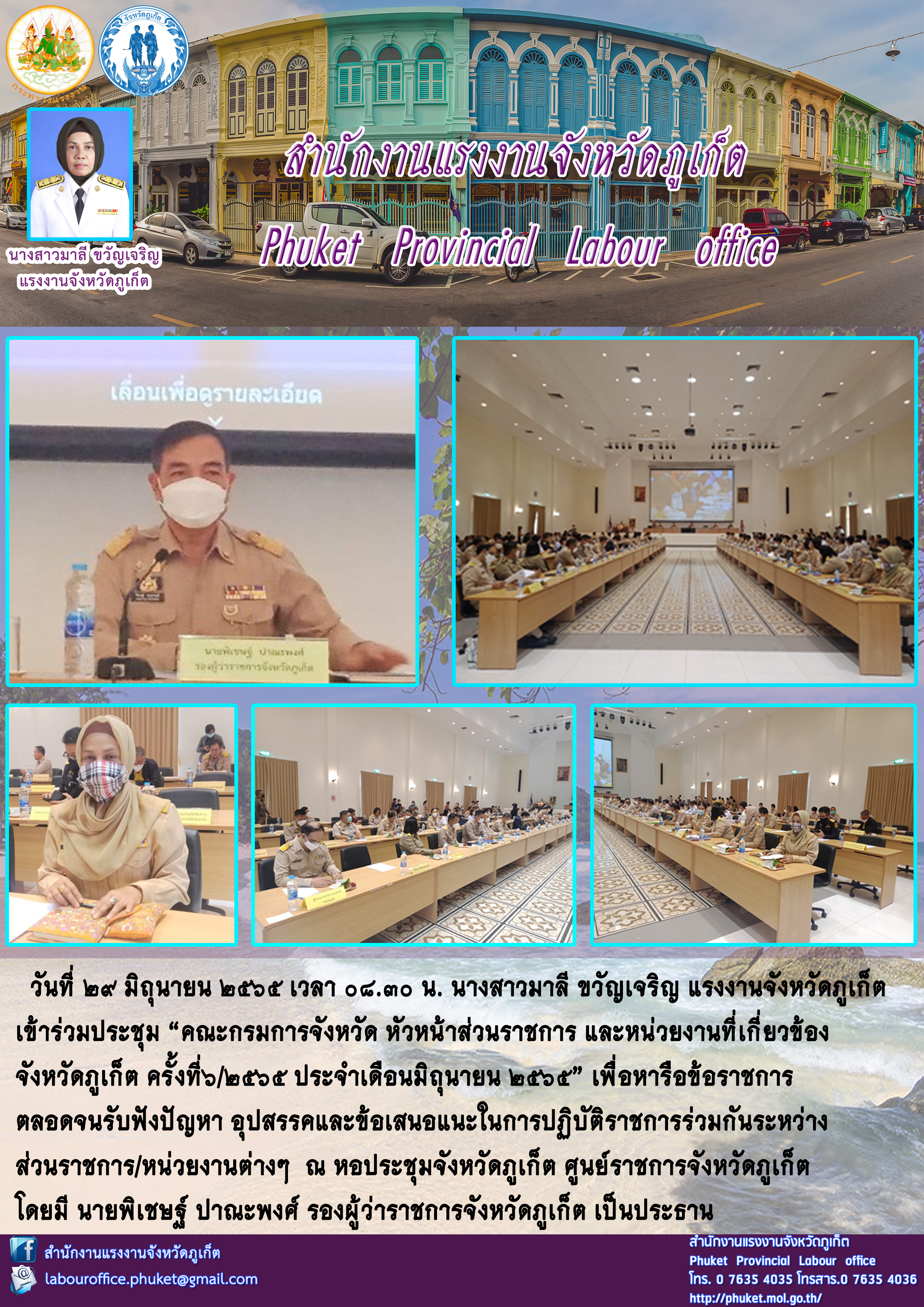 แรงงานจังหวัดภูเก็ต ร่วมประชุม “คณะกรมการจังหวัด หัวหน้าส่วนราชการ และหน่วยงานที่เกี่ยวข้อง จังหวัดภูเก็ต ครั้งที่6/2565 ประจำเดือนมิถุนายน 2565”