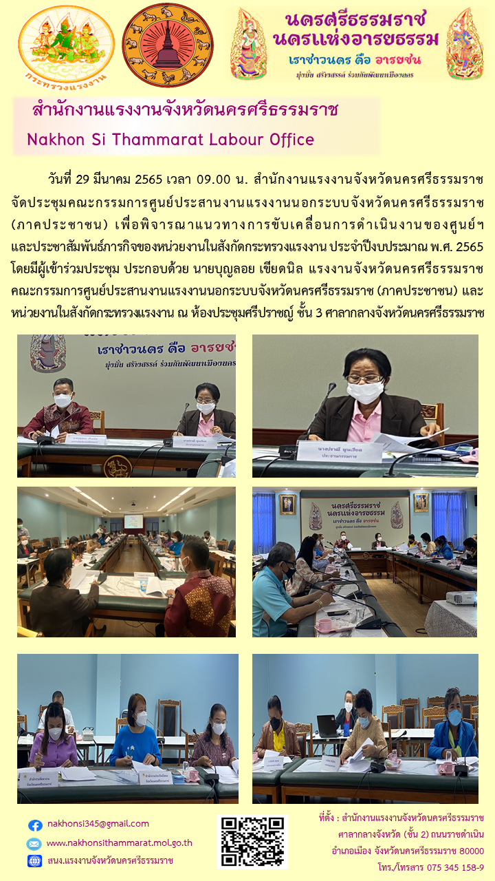 วันที่ 29 มีนาคม 2565 เวลา 09.00 น. สำนักงานแรงงานจังหวัดนครศรีธรรมราช จัดประชุมคณะกรรมการศูนย์ประสานงานแรงงานนอกระบบจังหวัดนครศรีธรรมราช(ภาคประชาชน) เพื่อพิจารณาแนวทางการขับเคลื่อนการดำเนินงานของศูนย์ฯและประชาสัมพันธ์ภารกิจของหน่วยงานในสังกัดกระทรวงแรงงาน ประจำปีงบประมาณ พ.ศ. 2565 โดยมีผู้เข้าร่วมประชุม ประกอบด้วย นายบุญลอย เขียดนิล แรงงานจังหวัดนครศรีธรรมราช คณะกรรมการศูนย์ประสานงานแรงงานนอกระบบจังหวัดนครศรีธรรมราช (ภาคประชาชน) และหน่วยงานในสังกัดกระทรวงแรงงาน ณ ห้องประชุมศรีปราชญ์ ชั้น 3 ศาลากลางจังหวัดนครศรีธรรมราช