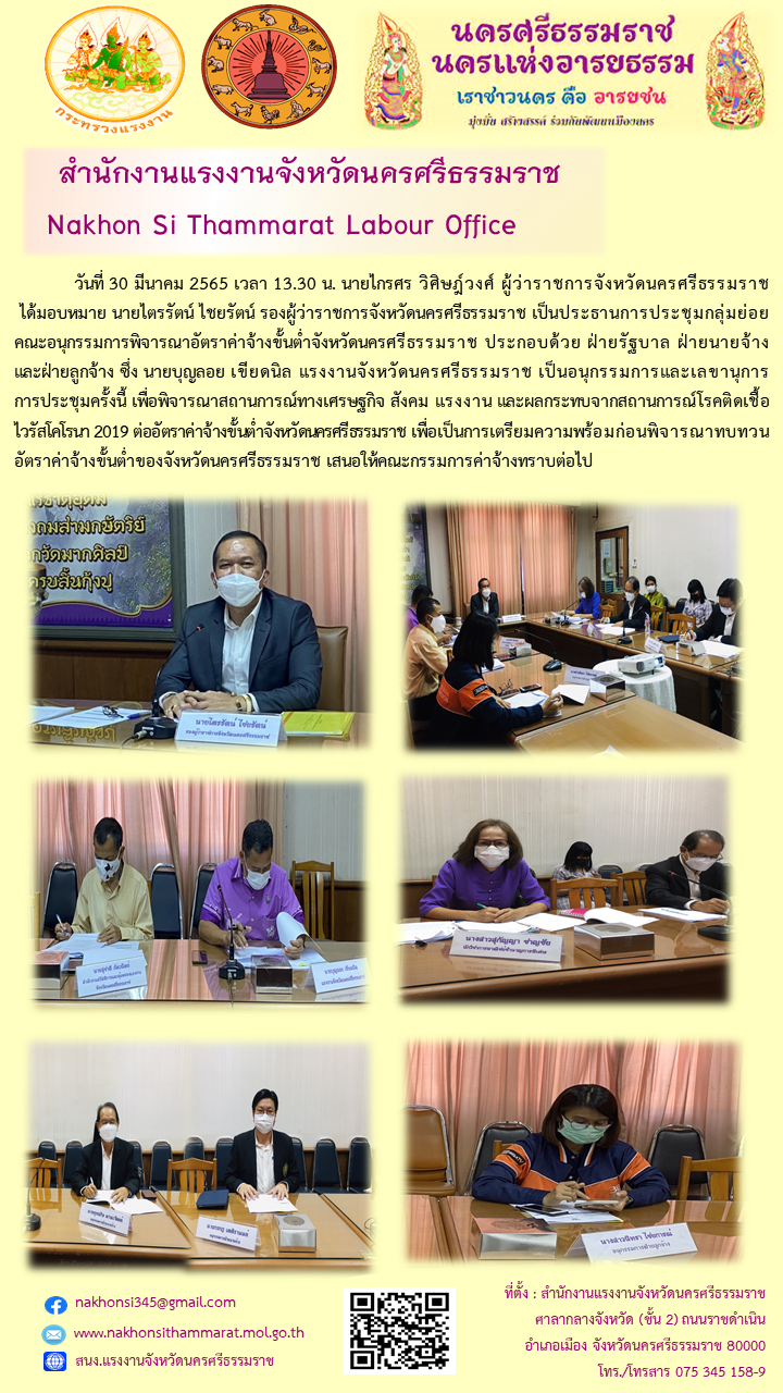 วันที่ 30 มีนาคม 2565 เวลา 13.30 น. นายไกรศร วิศิษฎ์วงศ์ ผู้ว่าราชการจังหวัดนครศรีธรรมราช ได้มอบหมาย นายไตรรัตน์ ไชยรัตน์ รองผู้ว่าราชการจังหวัดนครศรีธรรมราช เป็นประธานการประชุมกลุ่มย่อยคณะอนุกรรมการพิจารณาอัตราค่าจ้างขั้นต่ำจังหวัดนครศรีธรรมราช ประกอบด้วย ฝ่ายรัฐบาล ฝ่ายนายจ้างและฝ่ายลูกจ้าง ซึ่ง นายบุญลอย เขียดนิล แรงงานจังหวัดนครศรีธรรมราช เป็นอนุกรรมการและเลขานุการ การประชุมครั้งนี้ เพื่อพิจารณาสถานการณ์ทางเศรษฐกิจ สังคม แรงงาน และผลกระทบจากสถานการณ์โรคติดเชื้อไวรัสโคโรนา 2019 ต่ออัตราค่าจ้างขั้นต่ำจังหวัดนครศรีธรรมราช เพื่อเป็นการเตรียมความพร้อมก่อนพิจารณาทบทวนอัตราค่าจ้างขั้นต่ำของจังหวัดนครศรีธรรมราช เสนอให้คณะกรรมการค่าจ้างทราบต่อไป