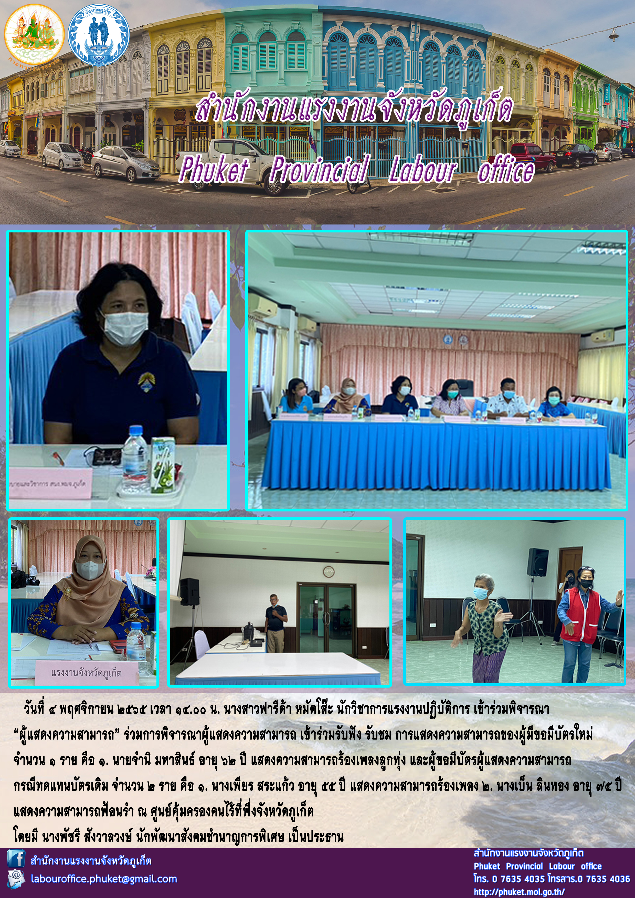 สรจ.ภูเก็ต มอบหมาย นางสาวฟารีด้า หมัดโส๊ะ นักวิชาการแรงงานปฏิบัติการ เข้าร่วมพิจารณา “ผู้แสดงความสามารถ”