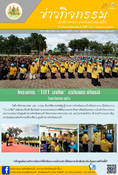 วันที่ 5 สิงหาคม 2562 เวลา 10.30น. มีนายวิชิต ชาตไพสิฐ ผู้ว่าราชการจังหวัดสระแก้วเป็นประธาน เปิดโครงการ “101 อาชีพ” เฉลิมพระเกียรติ เนื่องในโอกาส มหามงคลพระราชพิธีพระบรมราชาภิเษก พร้อมด้วยหน่วยงานในสังกัดกระทรวงแรงงาน หน่วยงานในศูนย์ราชก