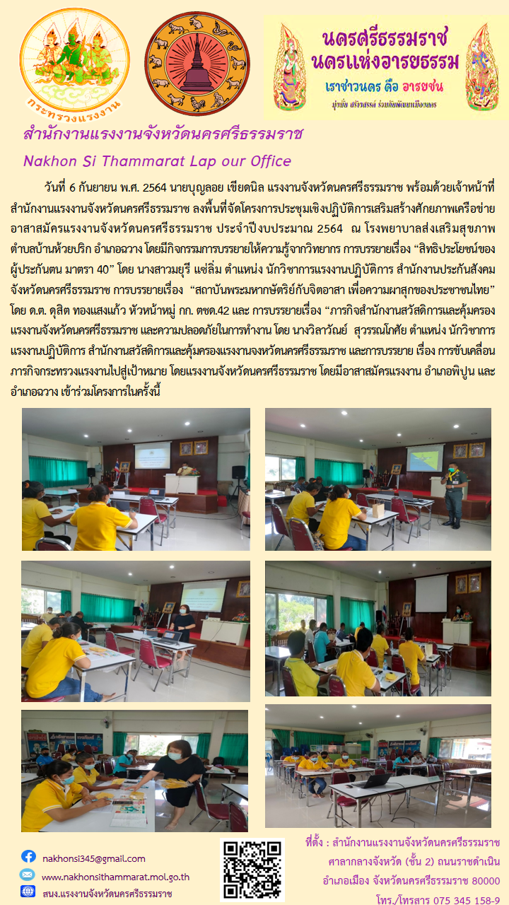 แรงงานจังหวัดนครศรีธรรมราช พร้อมด้วยเจ้าหน้าที่สำนักงานแรงงานจังหวัดนครศรีธรรมราช ลงพื้นที่จัดโครงการประชุมเชิงปฏิบัติการเสริมสร้างศักยภาพเครือข่ายอาสาสมัครแรงงานจังหวัดนครศรีธรรมราช ประจำปีงบประมาณ 2564