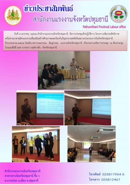 วันที่ 7 มกราคม 2562 สำนักงานแรงงานจังหวัดปทุมธานี จัดการประชุมเชิงปฏิบัติการ โครงการเพิ่มประสิทธิภาพเครือข่ายอาสาสมัครแรงงานเพื่อเสริมสร้างศักยภาพและป้องกันปัญหายาเสพติดในสถานประกอบการในจังหวัดปทุมธานี ปีงบประมาณ 2562