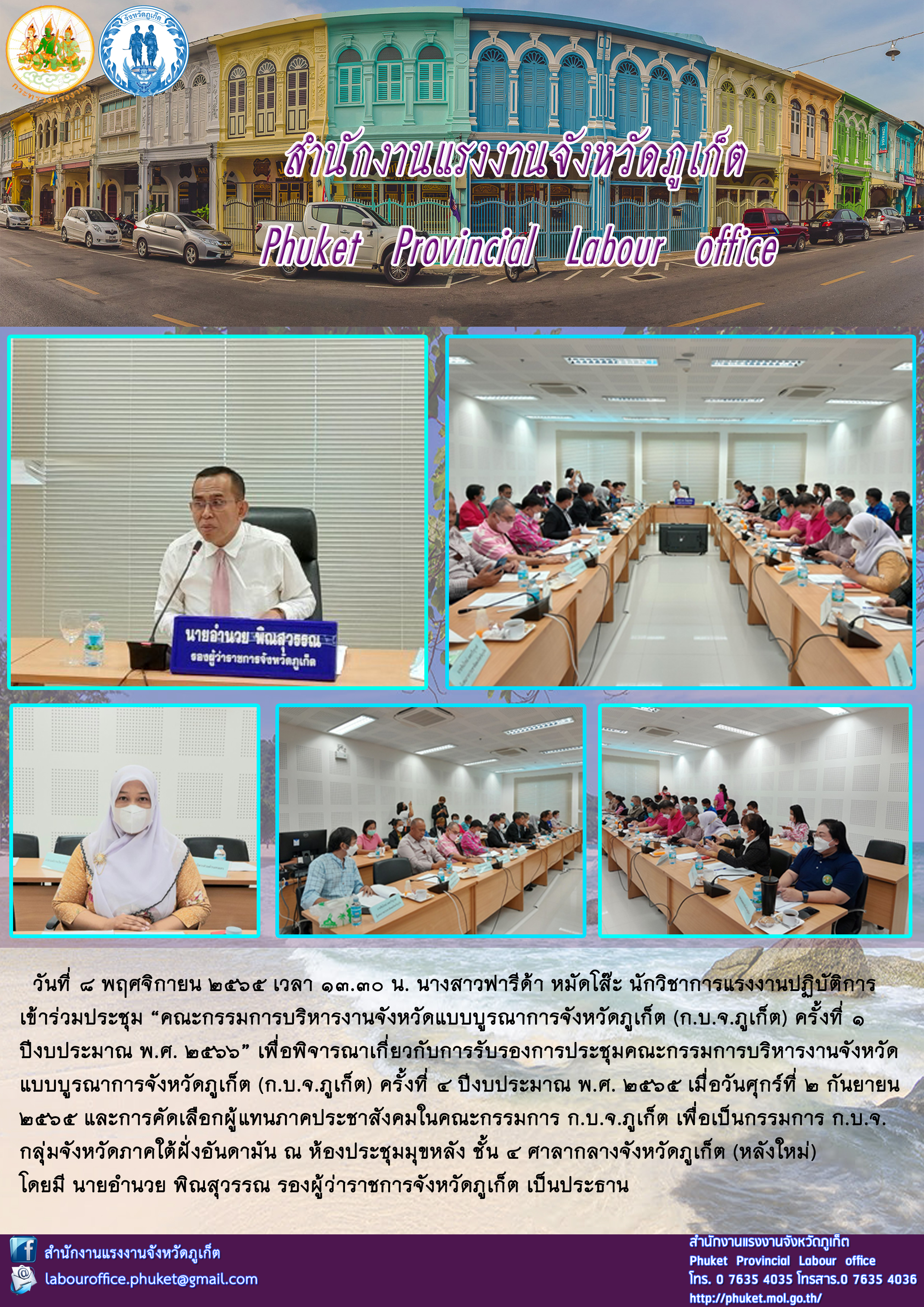 วันที่ 8 พฤศจิกายน 2565 เวลา 13.30 น. นางสาวฟารีด้า หมัดโส๊ะ นักวิชาการแรงงานปฏิบัติการ เข้าร่วมประชุม “คณะกรรมการบริหารงานจังหวัดแบบบูรณาการจังหวัดภูเก็ต (ก.บ.จ.ภูเก็ต) ครั้งที่ 1 ปีงบประมาณ พ.ศ. 2566”