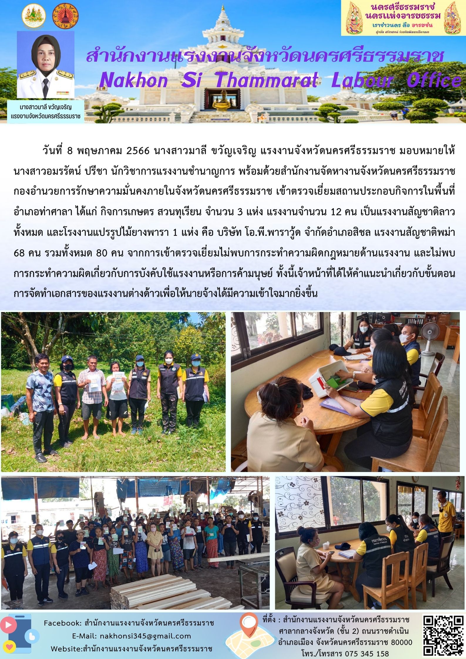 สรจ.นครศรีธรรมราช เข้าตรวจเยี่ยมสถานประกอบกิจการในพื้นที่อำเภอท่าศาลา จากการเข้าตรวจเยี่ยมไม่พบการกระทำความผิดกฎหมายด้านแรงงาน