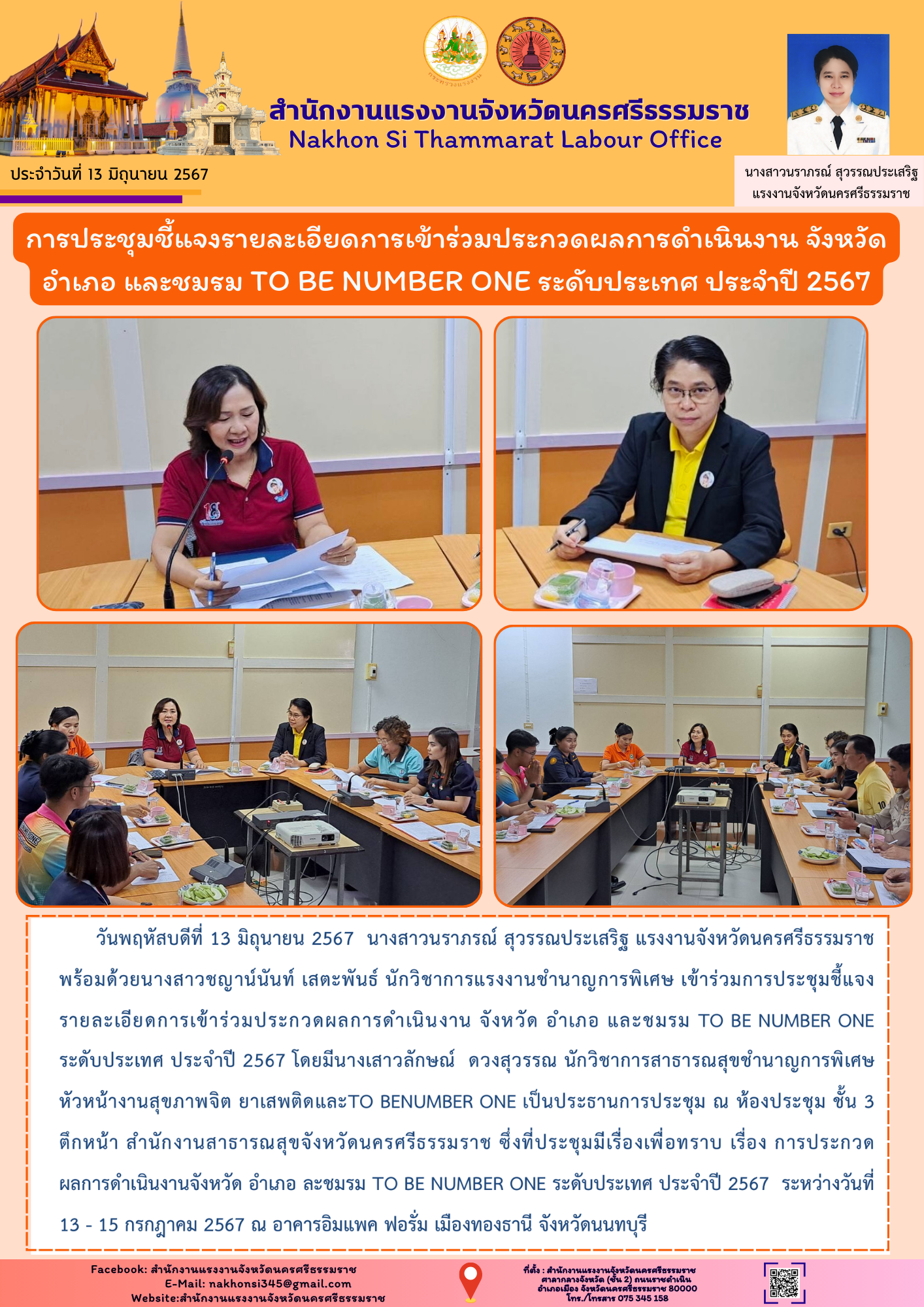 วันพฤหัสบดีที่ 13 มิถุนายน 2567 นางสาวนราภรณ์ สุวรรณประเสริฐ แรงงานจังหวัดนครศรีธรรมราช พร้อมด้วยนางสาวชญาน์นันท์ เสตะพันธ์ นักวิชาการแรงงานชำนาญการพิเศษ เข้าร่วมการประชุมชี้แจงรายละเอียดการเข้าร่วมประกวดผลการดำเนินงาน จังหวัด อำเภอ และชมรม TO BE NUMBER ONE ระดับประเทศ ประจำปี 2567