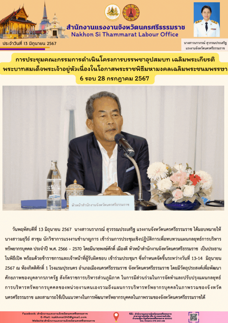 วันพฤหัสบดีที่ 13 มิถุนายน 2567 นางสาวนราภรณ์ สุวรรณประเสริฐ แรงงานจังหวัดนครศรีธรรมราช ได้มอบหมายให้นางสาวมยุรีย์ สาชุม นักวิชาการแรงงานชำนาญการ เข้าร่วมการประชุมเชิงปฎิบัติการเพื่อทบทวนแผนกลยุทธ์การบริหารทรัพยากรบุคคล ประจำปี พ.ศ. 2566-2570 ณ ห้องกิตติศักดิ์ 1 โรงแรมปุระนคร อำเภอเมืองนครศรีธรรมราช จังหวัดนครศรีธรรมราช