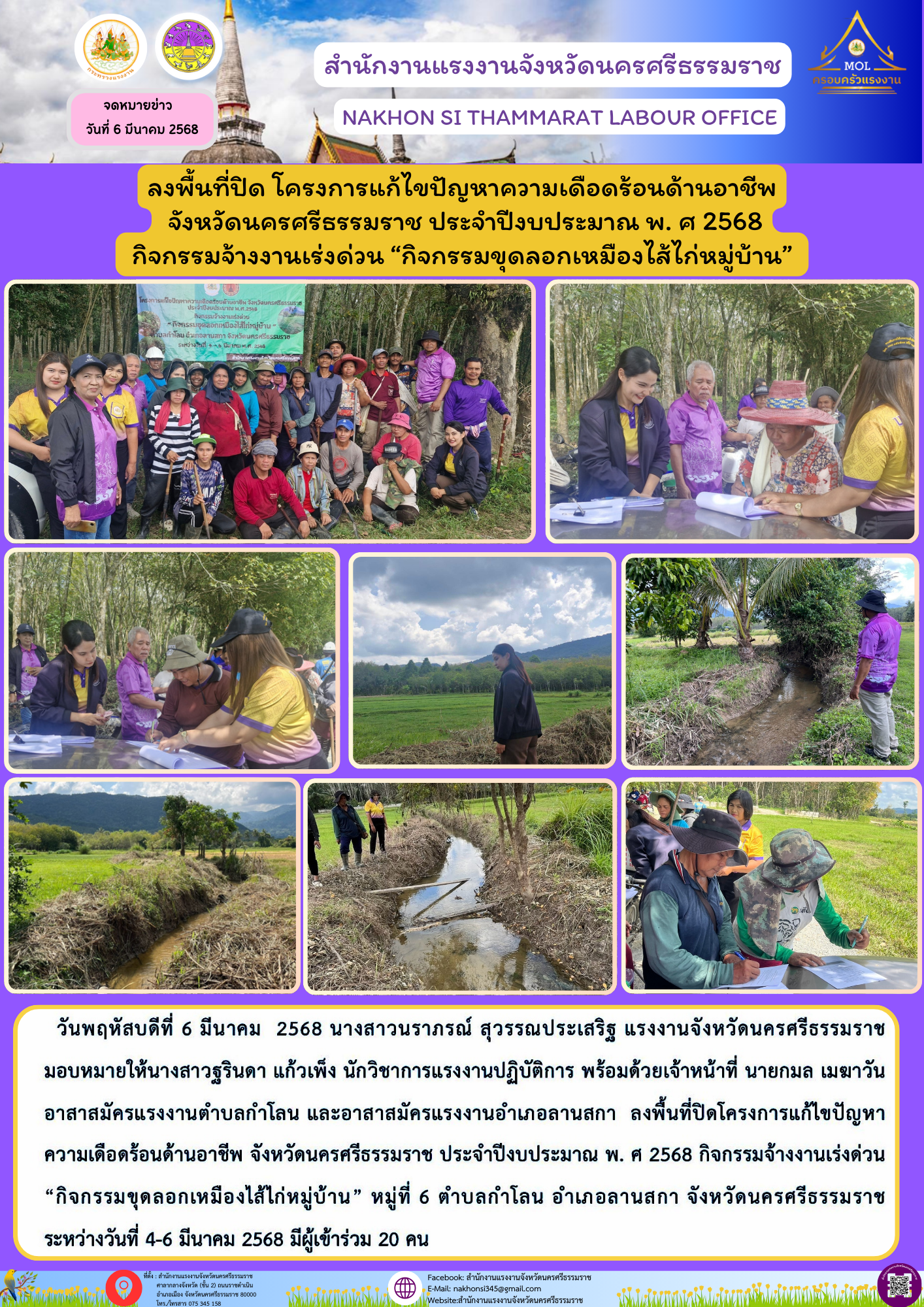 วันพฤหัสบดีที่ 6 มีนาคม 2568 นางสาวนราภรณ์ สุวรรณประเสริฐ แรงงานจังหวัดนครศรีธรรมราช มอบหมายให้นางสาวฐรินดา แก้วเพ็ง นักวิชาการแรงงานปฏิบัติการ พร้อมด้วยเจ้าหน้าที่ นายกมล เมฆาวัน อาสาสมัครแรงงานตำบลกำโลน และอาสาสมัครแรงงานอำเภอลานสกา ลงพื้นที่ปิดโครงการแก้ไขปัญหาความเดือดร้อนด้านอาชีพ จังหวัดนครศรีธรรมราช ประจำปีงบประมาณ พ. ศ 2568 กิจกรรมจ้างงานเร่งด่วน “กิจกรรมขุดลอกเหมืองไส้ไก่หมู่บ้าน” หมู่ที่ 6 ตำบลกำโลน อำเภอลานสกา จังหวัดนครศรีธรรมราช ระหว่างวันที่ 4-6 มีนาคม 2568 มีผู้เข้าร่วม 20 คน