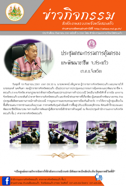 วันพุธที่ 19 กันยายน 2561 เวลา 09.30 น. นายพรพจน์ เพ็ญพาส ผู้ว่าราชการจังหวัดสระแก้ว มอบหมายให้ นายรณรงค์ นครจินดา รองผู้ว่าราชการจังหวัดสระแก้ว เป็นประธานการประชุมคณะกรรมการคุ้มครองและพัฒนาอาชีพ จ.สระแก้ว (ก.ค.อ.จังหวัด) ตามกฎหมายว่าด้วยการ