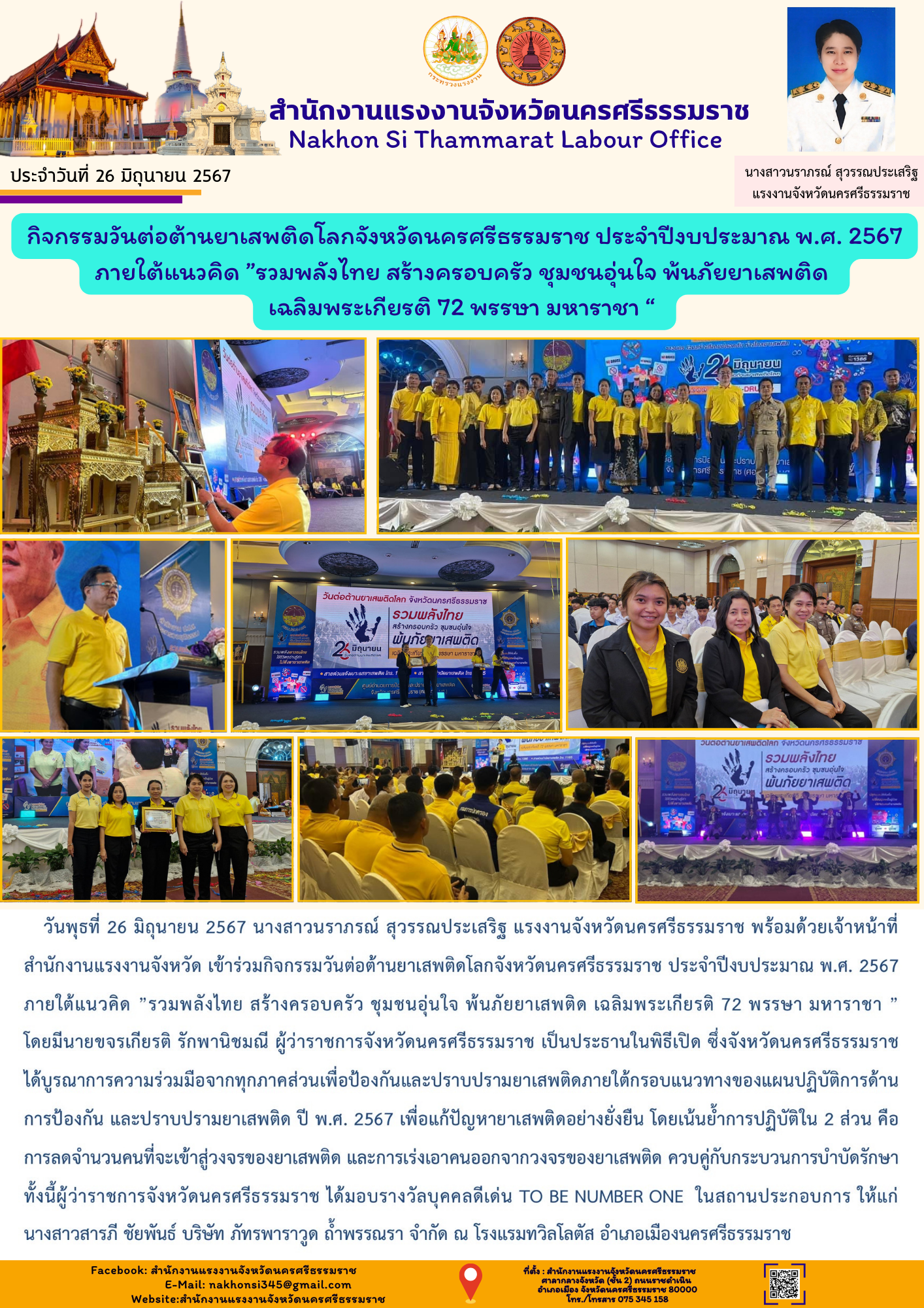 วันพุธที่ 26 มิถุนายน 2567 นางสาวนราภรณ์ สุวรรณประเสริฐ แรงงานจังหวัดนครศรีธรรมราช พร้อมด้วยเจ้าหน้าที่สำนักงานแรงงานจังหวัด เข้าร่วมกิจกรรมวันต่อต้านยาเสพติดโลกจังหวัดนครศรีธรรมราช ประจำปีงบประมาณ พ.ศ.2567 ภายใต้แนวคิด ”รวมพลังไทย สร้างครอบครัว ชุมชนอุ่นใจ พ้นภัยยาเสพติด เฉลิมพระเกียรติ 72 พรรษา มหาราชา “