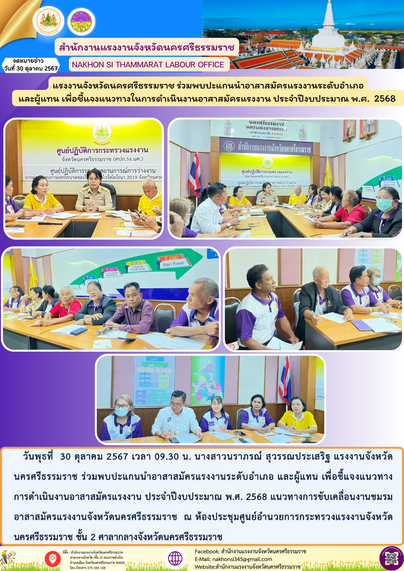วันพุธที่ 30 ตุลาคม 2567 เวลา 09.30 น. นางสาวนราภรณ์ สุวรรณประเสริฐ แรงงานจังหวัดนครศรีธรรมราช ร่วมพบปะแกนนำอาสาสมัครแรงงานระดับอำเภอ และผู้แทน เพื่อชี้แจงแนวทางการดำเนินงานอาสาสมัครแรงงาน ประจำปีงบประมาณ พ.ศ. 2568 แนวทางการขับเคลื่อนงานชมรมอาสาสมัครแรงงานจังหวัดนครศรีธรรมราช ณ ห้องประชุมศูนย์อำนวยการกระทรวงแรงงานจังหวัดนครศรีธรรมราช ชั้น 2 ศาลากลางจังหวัดนครศรีธรรมราช