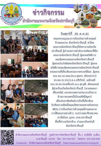 วันศุกร์ที่ 26 ตุลาคม 2561 คณะตรวจบูรณาการป้องกันการค้ามนุษย์ด้านแรงงาน จังหวัดปราจีนบุรี นำโดย แรงงานจังหวัดปราจีนบุรีจัดหางานจังหวัดปราจีนบุรี ผู้อำนวยการสำนักงานพัฒนาฝีมือแรงงานจังหวัดปราจีนบุรี ผู้แทนสวัสดิการและคุ้มครองแรงงานจังหวัดปราจีนบุรี