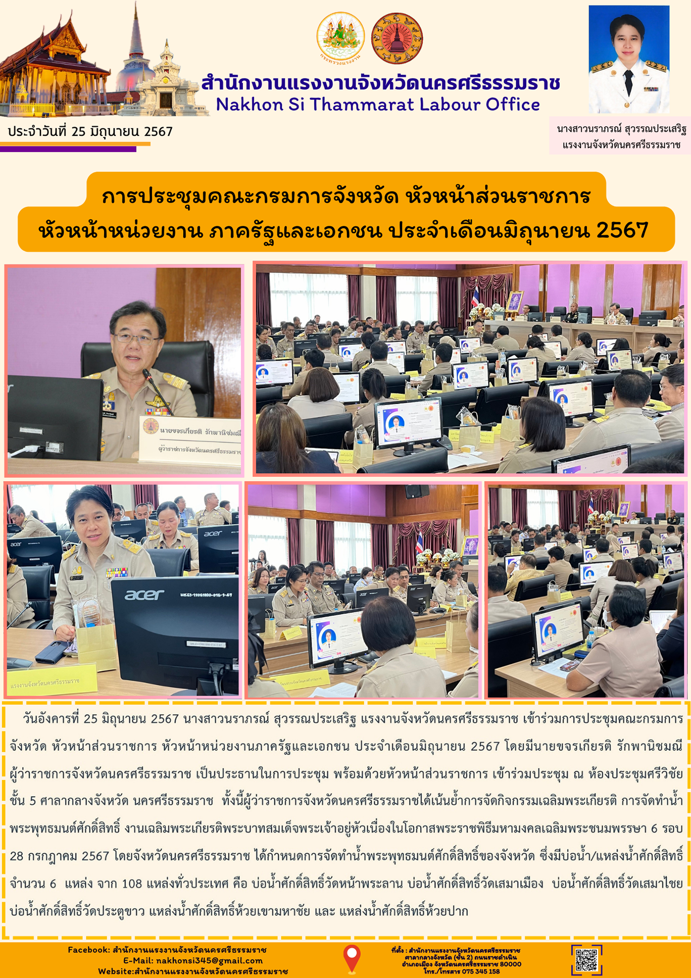 วันอังคารที่ 25 มิถุนายน 2567 เวลา 09.30 น. นางสาวนราภรณ์ สุวรรณประเสริฐ แรงงานจังหวัดนครศรีธรรมราช เข้าร่วมการประชุมคณะกรมการจังหวัด หัวหน้าส่วนราชการ หัวหน้าหน่วยงานภาครัฐและเอกชน ประจำเดือนมิถุนายน 2567 โดยมีนายขจรเกียรติ รักพานิชมณี ผู้ว่าราชการจังหวัดนครศรีธรรมราช เป็นประธานในการประชุม พร้อมด้วยหัวหน้าส่วนราชการ เข้าร่วมประชุม ณ ห้องประชุมศรีวิชัย ชั้น 5 ศาลากลางจังหวัด นครศรีธรรมราช