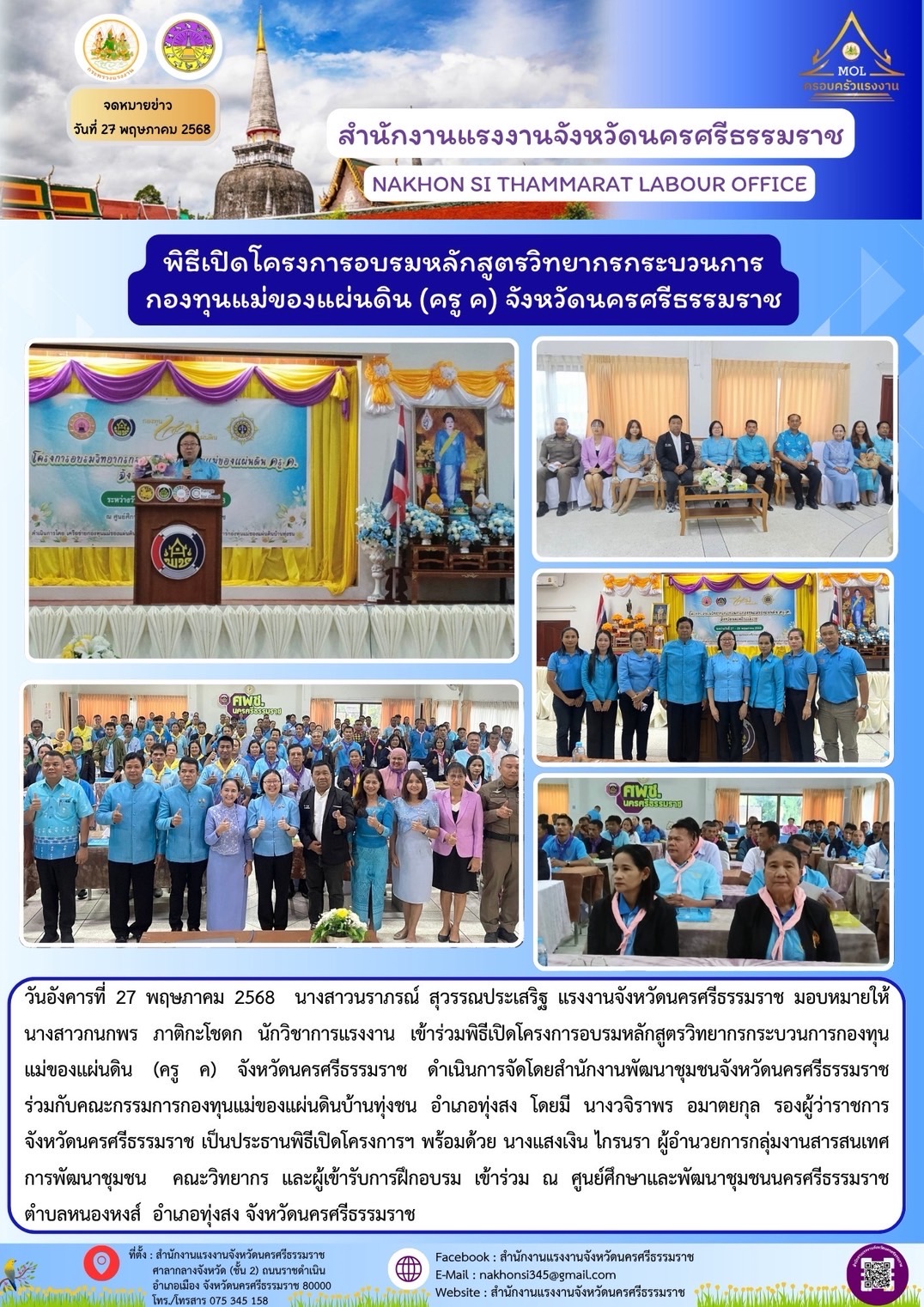 วันอังคารที่ 27 พฤษภาคม 2568 นางสาวนราภรณ์ สุวรรณประเสริฐ แรงงานจังหวัดนครศรีธรรมราช มอบหมายให้ นางสาวกนกพร ภาติกะโชดก นักวิชาการแรงงาน เข้าร่วมพิธีเปิดโครงการอบรมหลักสูตรวิทยากรกระบวนการกองทุน แม่ของแผ่นดิน (ครู ค) จังหวัดนครศรีธรรมราช ดำเนินการจัดโดยสำนักงานพัฒนาชุมชนจังหวัดนครศรีธรรมราช ร่วมกับคณะกรรมการกองทุนแม่ของแผ่นดินบ้านทุ่งชน อำเภอทุ่งสง โดยมี นางวจิราพร อมาตยกุล รองผู้ว่าราชการจังหวัดนครศรีธรรมราช เป็นประธานพิธีเปิดโครงการฯ พร้อมด้วย นางแสงเงิน ไกรนรา ผู้อำนวยการกลุ่มงานสารสนเทศการพัฒนาชุมชน คณะวิทยากร และผู้เข้ารับการฝึกอบรม เข้าร่วม ณ ศูนย์ศึกษาและพัฒนาชุมชนนครศรีธรรมราช ตำบลหนองหงส์ อำเภอทุ่งสง จังหวัดนครศรีธรรมราช