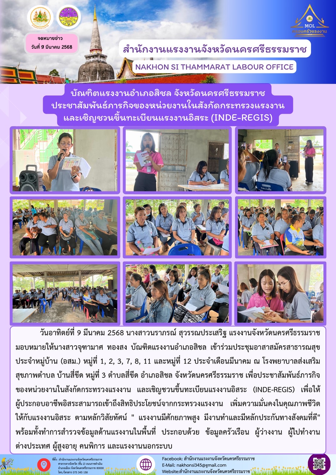 วันอาทิตย์ที่ 9 มีนาคม 2568 นางสาวนราภรณ์ สุวรรณประเสริฐ แรงงานจังหวัดนครศรีธรรมราช มอบหมายให้นางสาวจุฑามาศ ทองสง บัณฑิตแรงงานอำเภอสิชล เข้าร่วมประชุมอาสาสมัครสาธารณสุขประจำหมู่บ้าน (อสม.) หมู่ที่ 1, 2, 3, 7, 8, 11 และหมู่ที่ 12 ประจำเดือนมีนาคม ณ โรงพยาบาลส่งเสริมสุขภาพตำบล บ้านสี่ขีด หมู่ที่ 3 ตำบลสี่ขีด อำเภอสิชล จังหวัดนครศรีธรรมราช เพื่อประชาสัมพันธ์ภารกิจของหน่วยงานในสังกัดกระทรวงแรงงาน และเชิญชวนขึ้นทะเบียนแรงงานอิสระ (INDE-REGIS) เพื่อให้ผู้ประกอบอาชีพอิสระสามารถเข้าถึงสิทธิประโยชน์จากกระทรวงแรงงาน