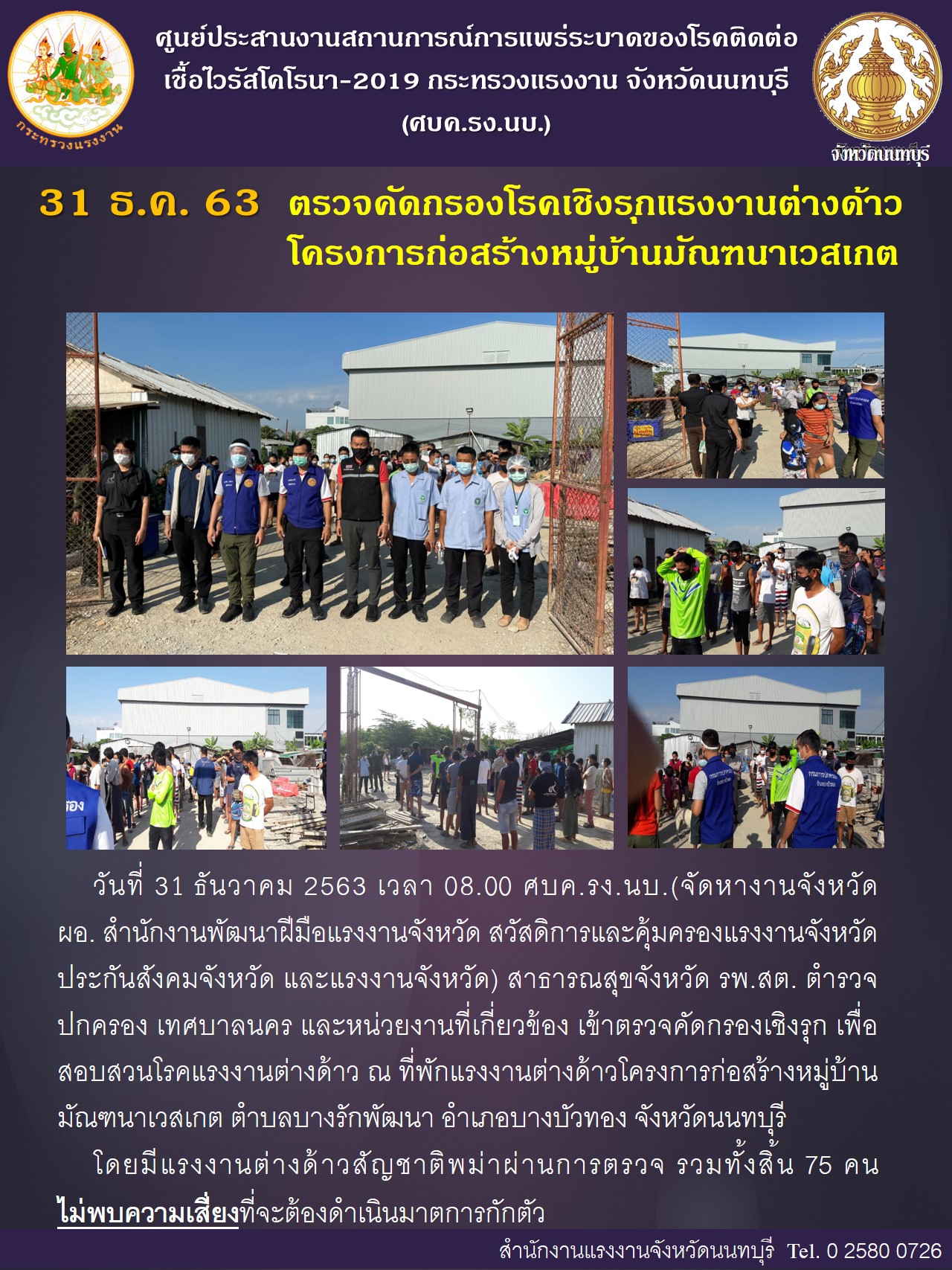 วันที่ 31 ธันวาคม 2563 เวลา 08.00 ศบค.รง.นบ. (จัดหางานจังหวัด ผอ.สำนักงานพัฒนาฝีมือแรงงานจังหวัด สวัสดิการและคุ้มครองแรงงานจังหวัด ประกันสังคมจังหวัด และแรงงานจังหวัด) สาธารณสุขจังหวัด รพ.สต. ตำรวจ ปกครอง เทศบาลนคร และหน่วยงานที่เกี่ยวข้อง เข้าตรวจคัดกรองเชิงรุก เพื่อสอบสวนโรคแรงงานต่างด้าว ณ ที่พักแรงงานต่างด้าวโครงการก่อสร้างหมู่บ้านมัณฑนาเวสเกต ตำบลบางรักพัฒนา อำเภอบางบัวทอง จังหวัดนนทบุรี