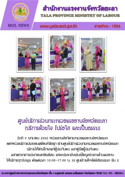 วันที่ 9 มกราคม 2562 หน่วยงานสังกัดกระทรวงแรงงานจังหวัดยะลา ออกหน่วยบริการประชาชนเคลื่อนที่เชิงรุก ผ่านศูนย์บริการร่วมกระทรวงแรงงานจังหวัดยะลา บริการให้คำปรึกษาแก่ผู้ประกันตน แจกคู่มือผู้ประกันตน แจกเอกสารการประกอบอาชีพอิสระ และประชาสัมพันธ์ข้อมูลข่าวสารด้านแรงงาน ให้บริการทุกวันพุธ ตั้งแต่เวลา 10.00-17.00 น. ณ ศูนย์การค้าฯโคลีเซี่ยมยะลา ชั้น 2