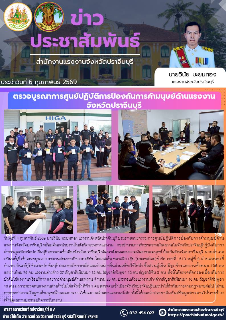 วันพุธที่ 4 กุมภาพันธ์ 2569 นายวินัย มะยมทอง แรงงานจังหวัดปราจีนบุรี ประธานคณะกรรมการศูนย์ปฏิบัติการป้องกันการค้ามนุษย์ด้านแรงงานจังหวัดปราจีนบุรี พร้อมด้วยหน่วยงานในสังกัดกระทรวงแรงงาน กองอำนวยการรักษาความมั่งคงภายในจังหวัดปราจีนบุรี ผู้บังคับการตำรวจภูธรจังหวัดปราจีนบุรี ตรวจคนเข้าเมืองจังหวัดปราจีนบุรี พัฒนาสังคมและความมั่นคงของมนุษย์ ป้องกันจังหวัดปราจีนบุรี นายอำเภอกบินทร์บุรี เข้าตรวจบูรณาการสถานประกอบกิจการ บริษัท ไฮแกสเค็ท พลาสติก กรุ๊ป (ประเทศไทย) จำกัด เลขที่ 513 หมู่ที่ 9 ตำบลหนองกี่ อำเภอกบินทร์บุรี จังหวัดปราจีนบุรี ประกอบกิจการผลิตและจำหน่ายชิ้นส่วนเครื่องใช้ไฟฟ้า ชิ้นส่วนตู้เย็น มีลูกจ้างแรงงานทั้งหมด 106 คน แรงงานไทย 79 คน แรงงานต่างด้าว 27 สัญชาติเมียนมา 12 คน สัญชาติกัมพูชา 12 คน สัญชาติจีน 3 คน ทั้งนี้ได้ตรวจคัดกรองเบื้องต้นการบังคับใช้แรงงานหรือบริการ และการค้ามนุษย์ด้านแรงงาน จำนวน 20 คน ประกอบด้วยแรงงานต่างด้าวสัญชาติเมียนมา 10 คน สัญชาติกัมพูชา 10 คน ผลการตรวจพบแรงงานต่างด้าวไม่ได้แจ้งเข้าที่พัก 1 คน ตรวจคนเข้าเมืองจังหวัดปราจีนบุรีแนะนำให้ดำเนินการตามกฎหมายต่อไป ไม่พบการกระทำความผิดฐานค้ามนุษย์ด้านแรงงาน การใช้แรงงานเด็กและแรงงานบังคับ ทั้งนี้ได้แนะนำประชาสัมพันธ์ข้อมูลข่าวสารให้นายจ้าง/เจ้าของสถานประกอบกิจการรับทราบ